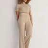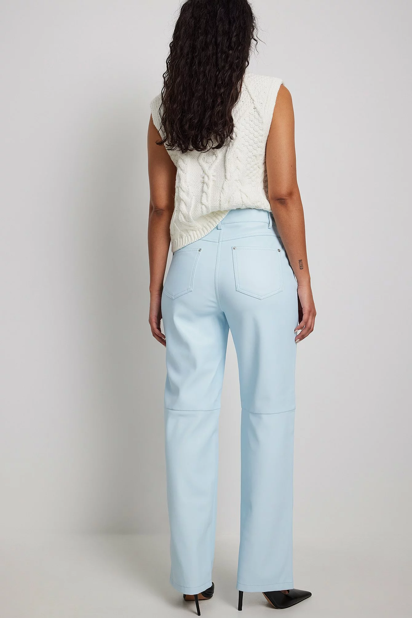 These pants feature a PU design. They have a high waist with a zipper and button closure and a five-pocket design. These pants feature belt loops, straight legs with seam details on the front and a soft inside.