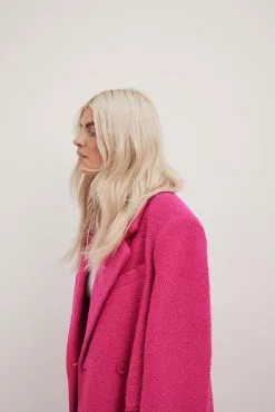 This coat features a textured material. It has a lapel neckline and padded shoulders. This coat features button closures down the front, two front flap pockets, a back slit detail and a lining.