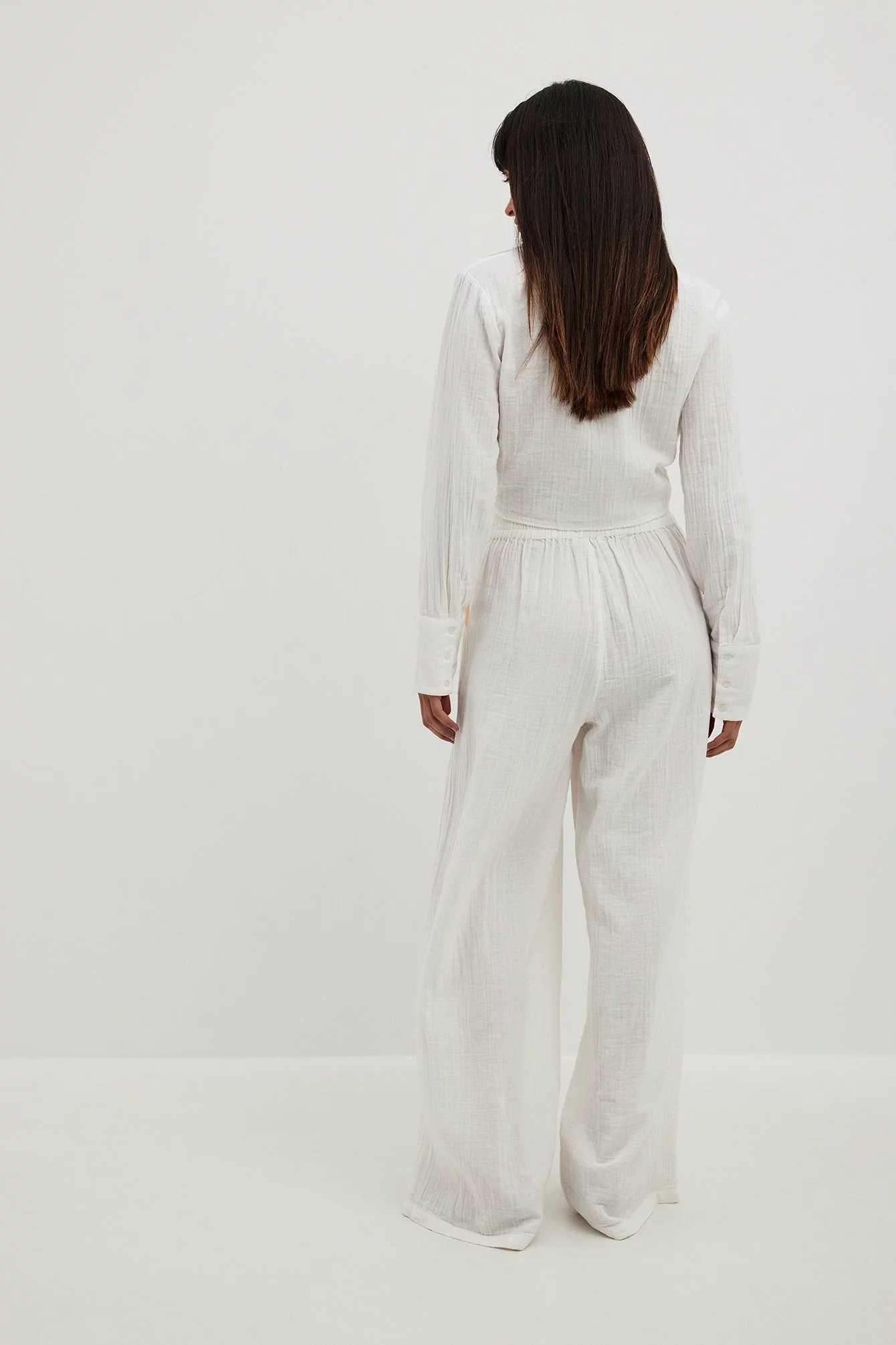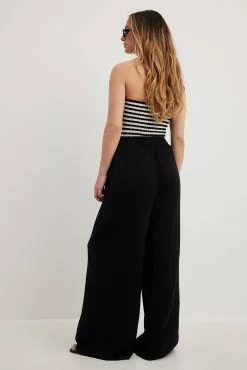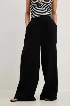 These pants feature a high waist with an elasticized waistband. They have side pockets and a flowy fit. These pants feature a wide leg and a structured material. Inseam length in size 36: 80 cm / 31.49 in.