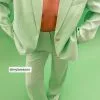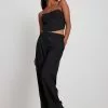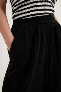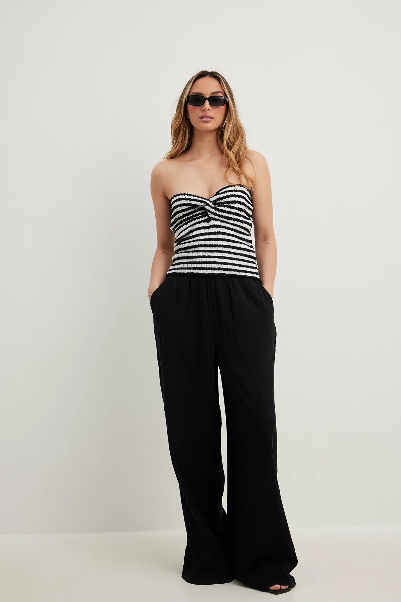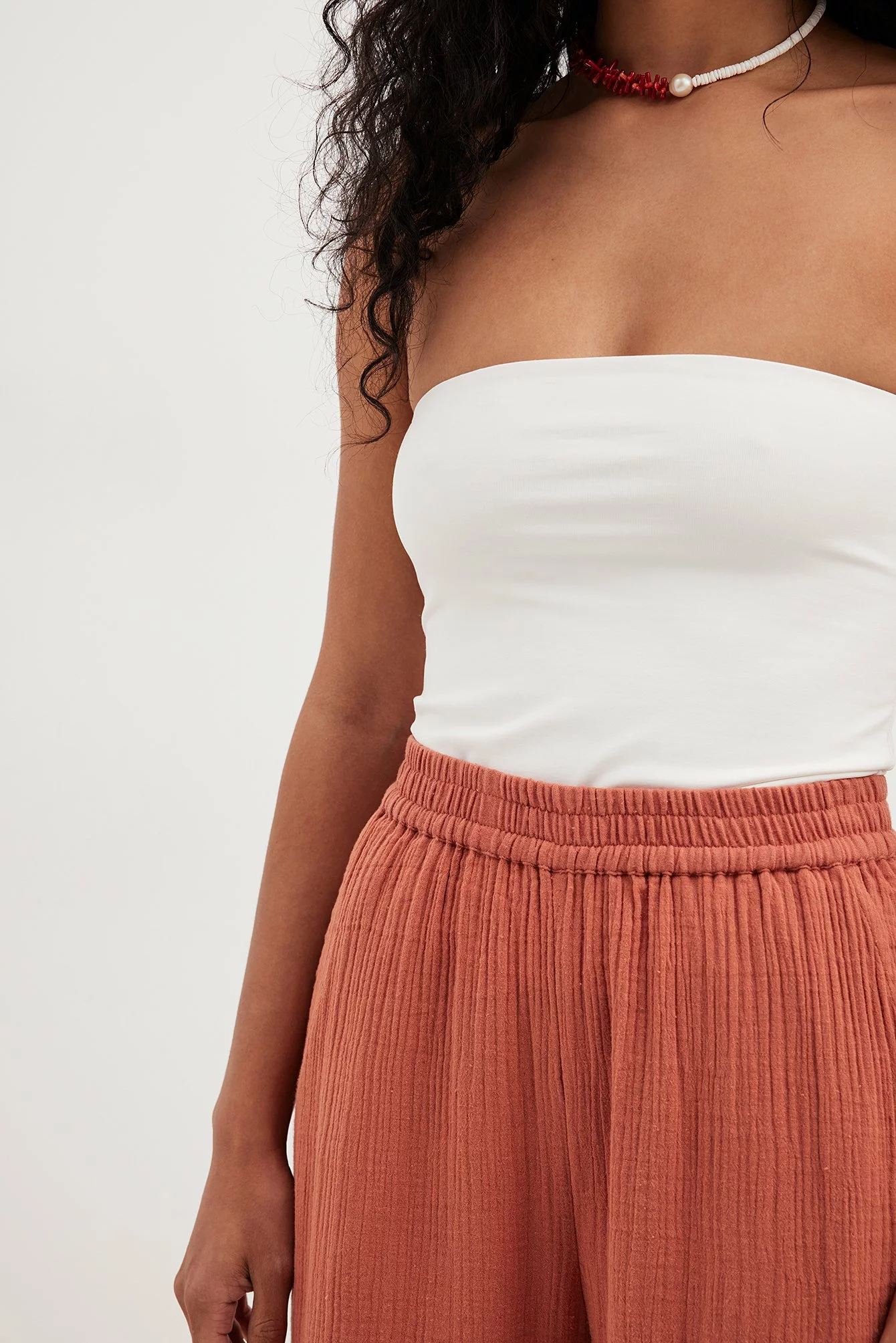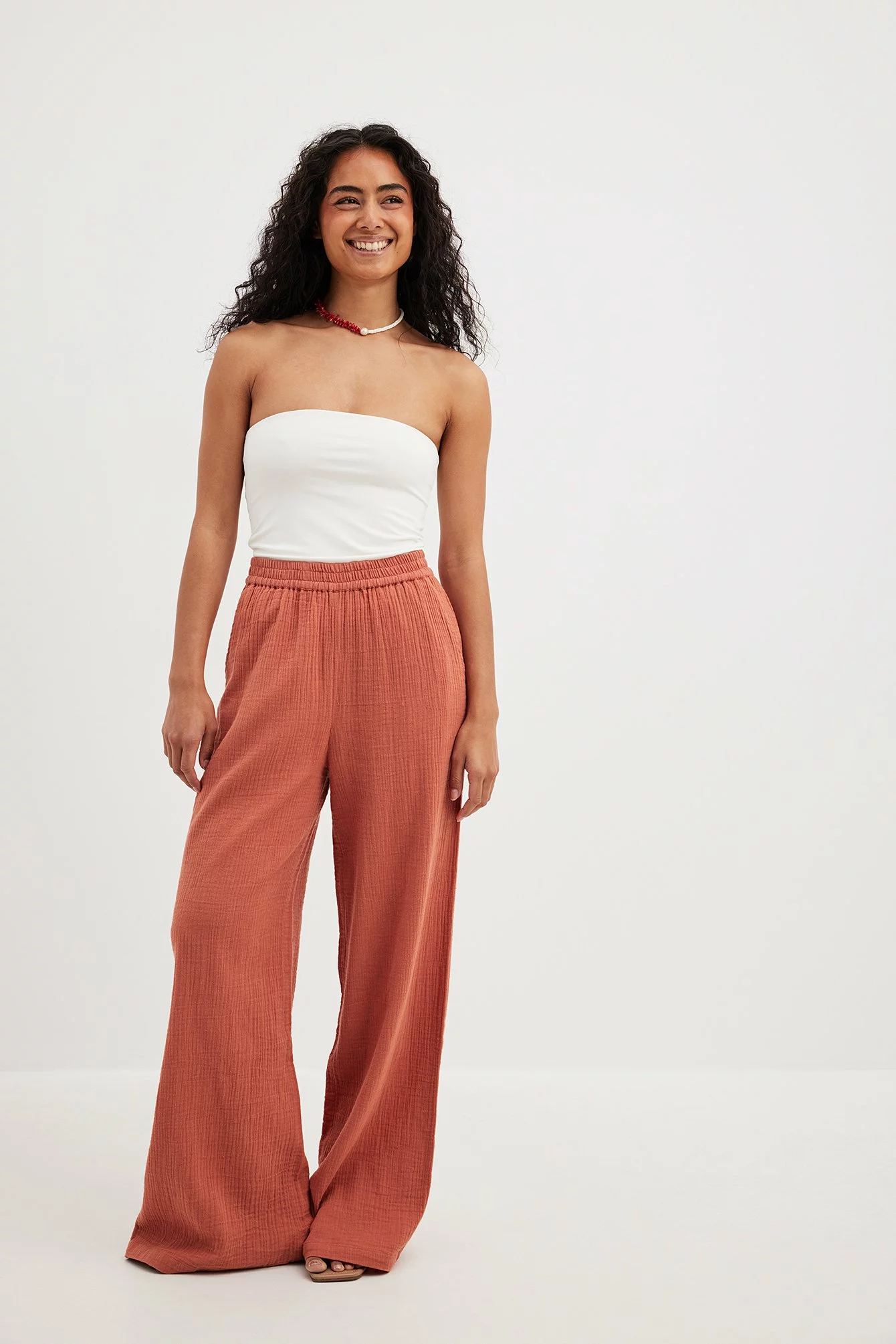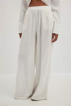 These pants feature a high waist with an elasticized waistband. They have side pockets and a flowy fit. These pants feature a wide leg and a structured material. Inseam length in size 36: 80 cm / 31.49 in.