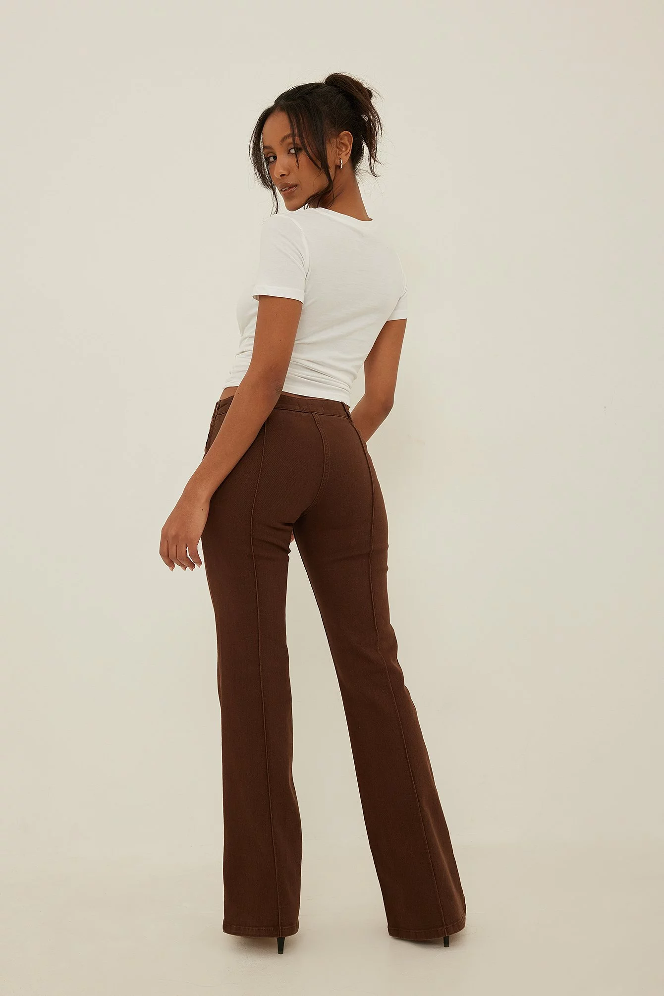 These jeans feature a low waist, a side zipper closure, skinny legs with a flare detail and a seam detail down the front.