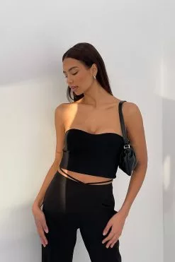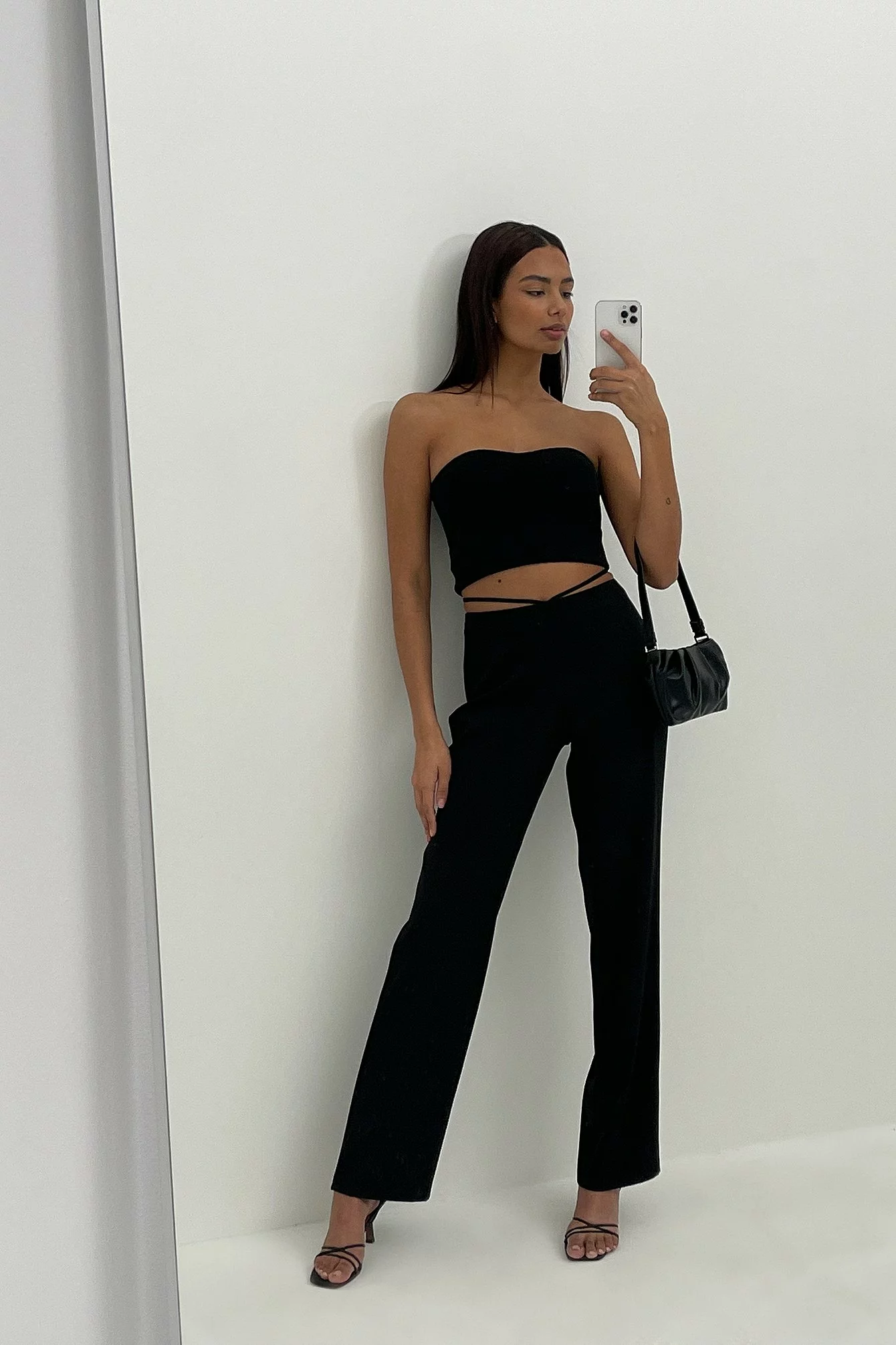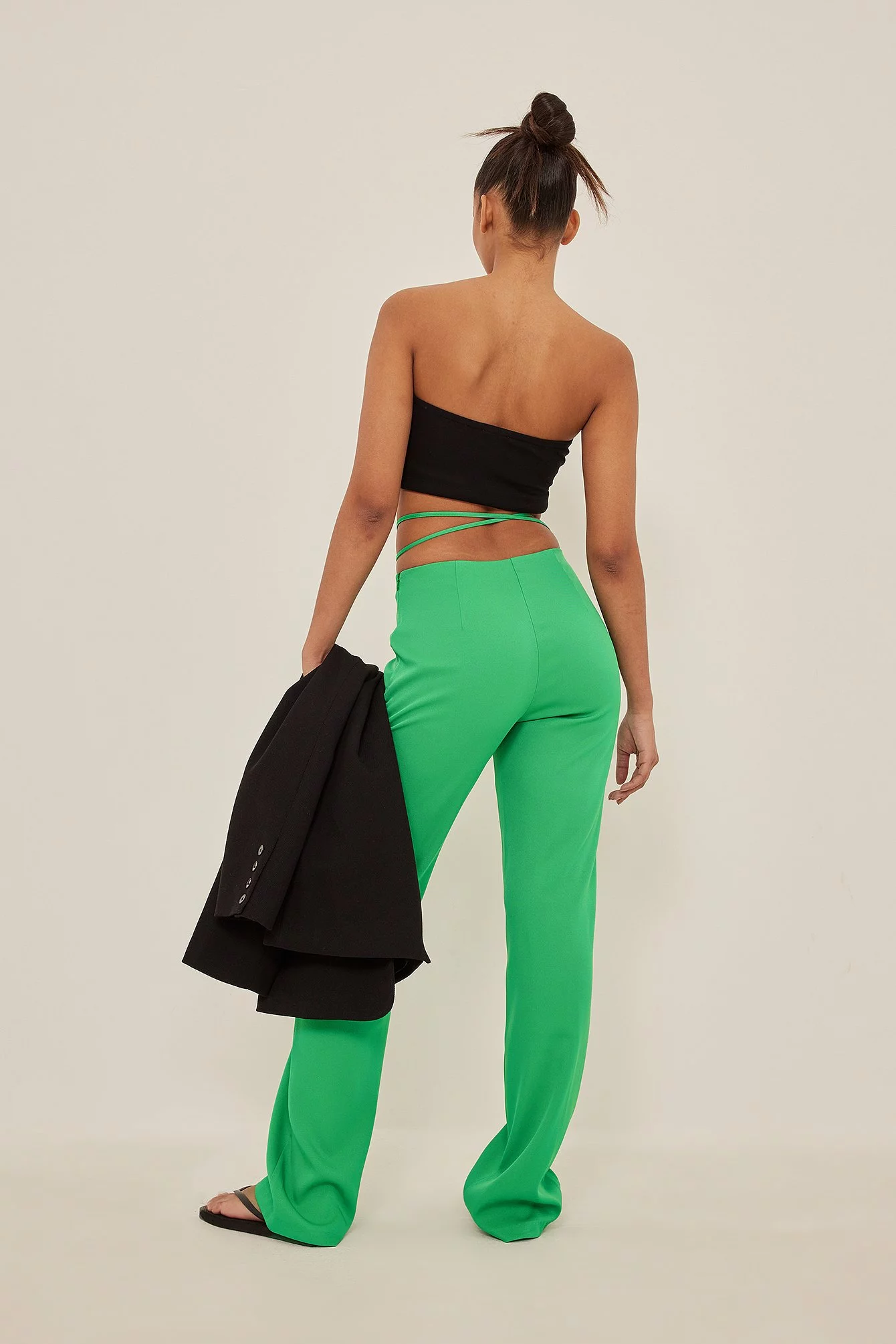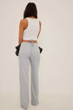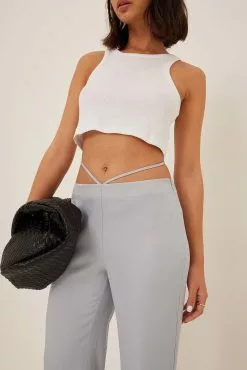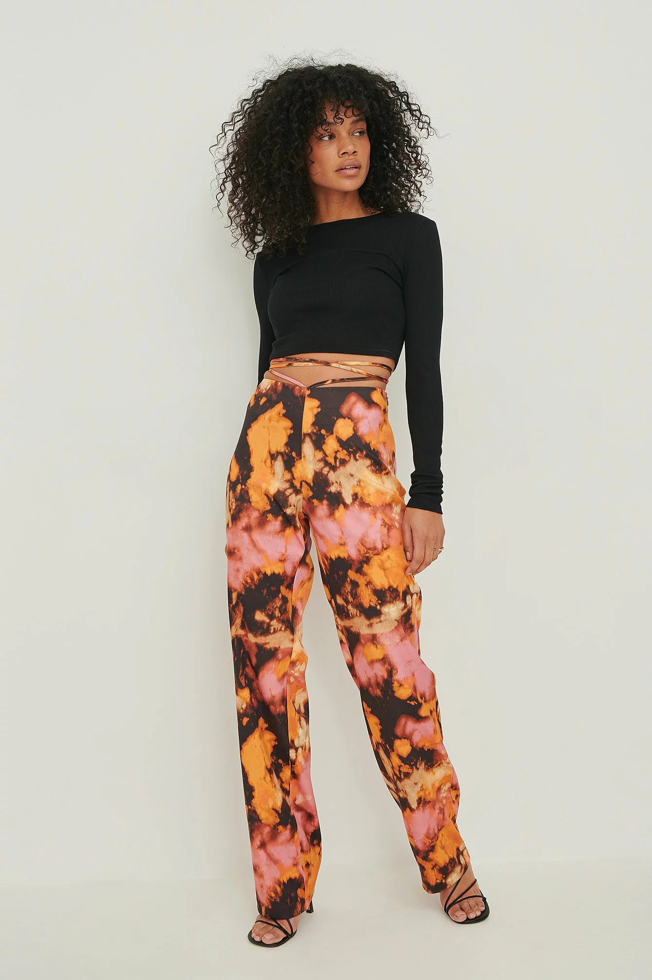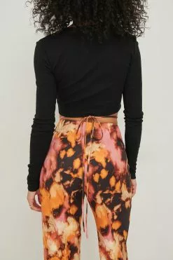 These pants feature a fabric with a satin touch, a high waist, a self-tie band around the waist, a side zipper closure and flared legs.