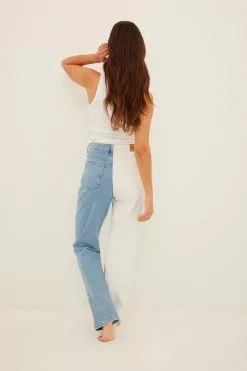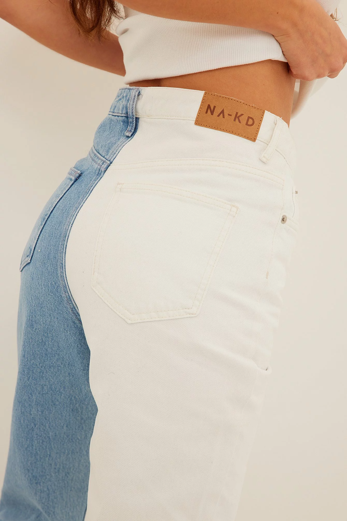 These jeans feature a high waist fit, a five-pocket design, a zipper and button closure, a straight fit and a two-color design.