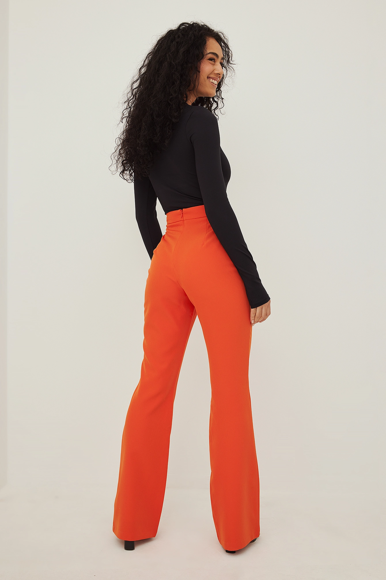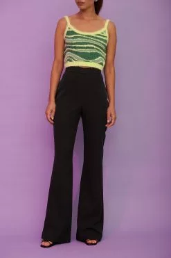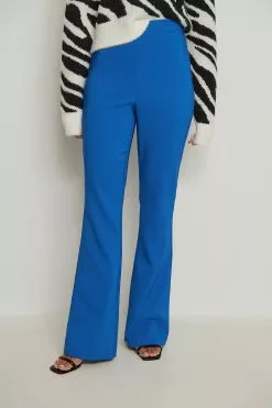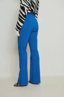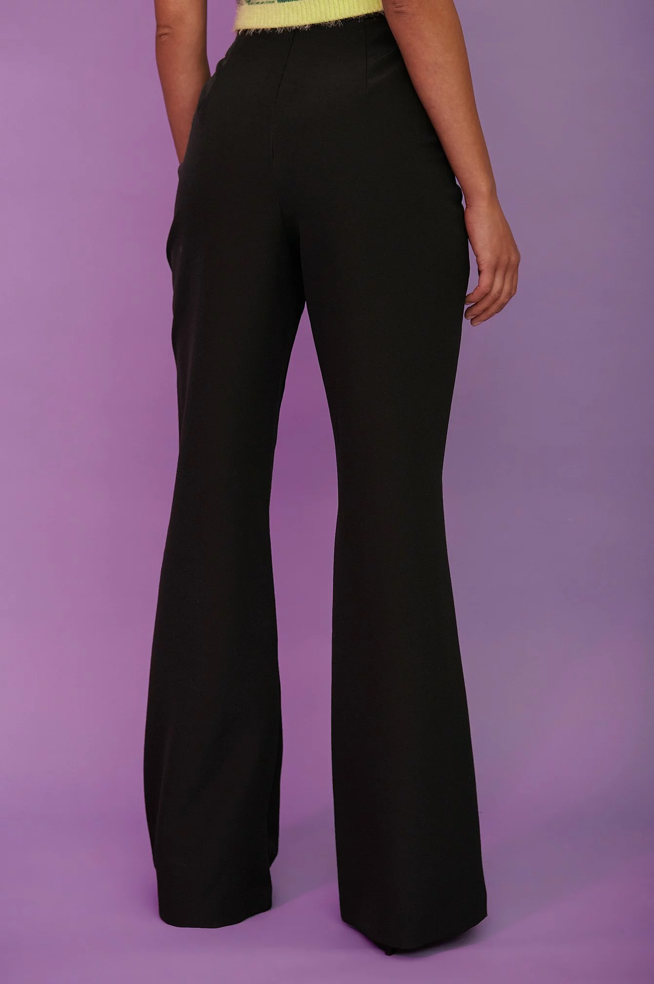 These suit pants feature a high waist, a concealed zipper closure on the back, a v-shaped detail at the waist and long wide legs.