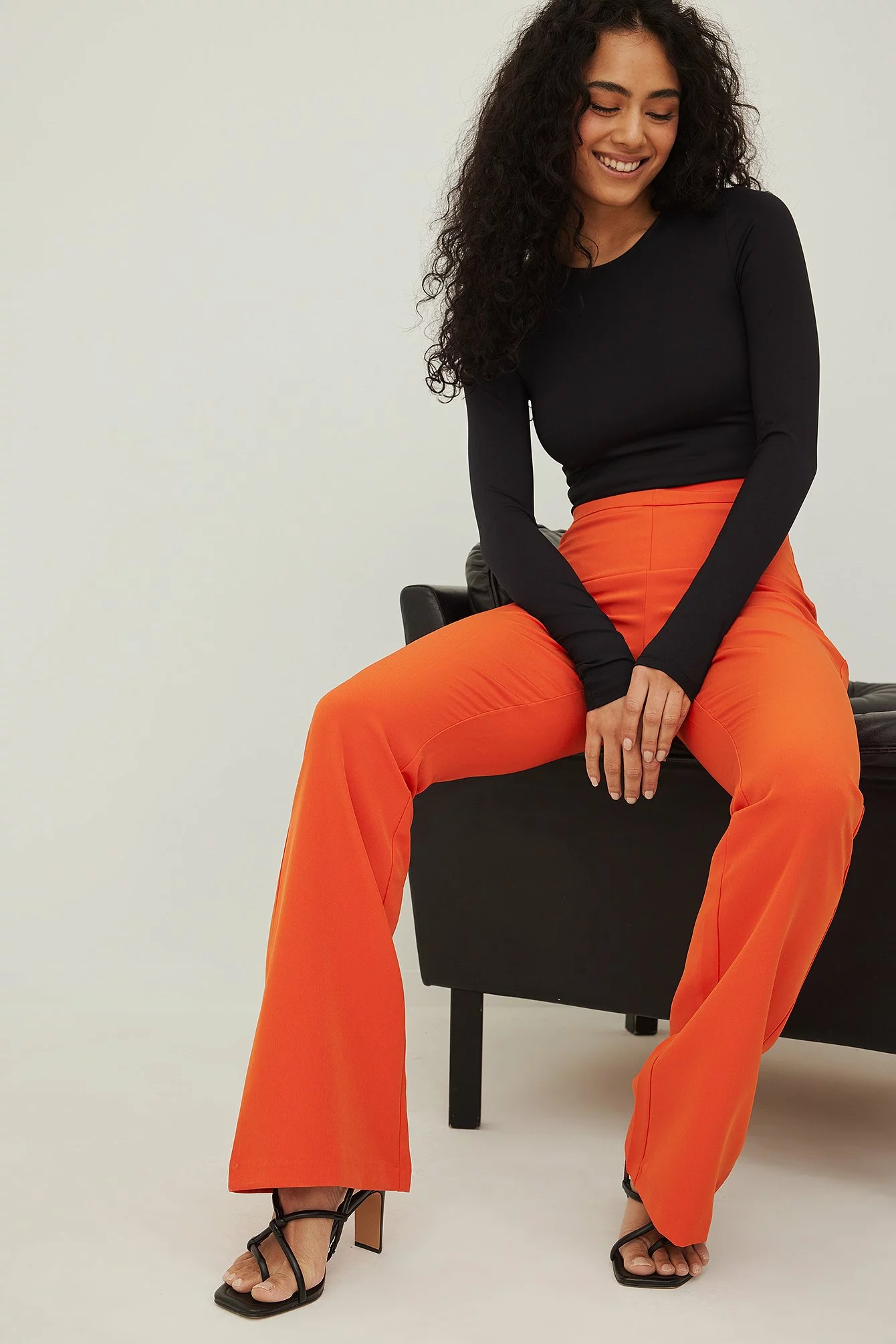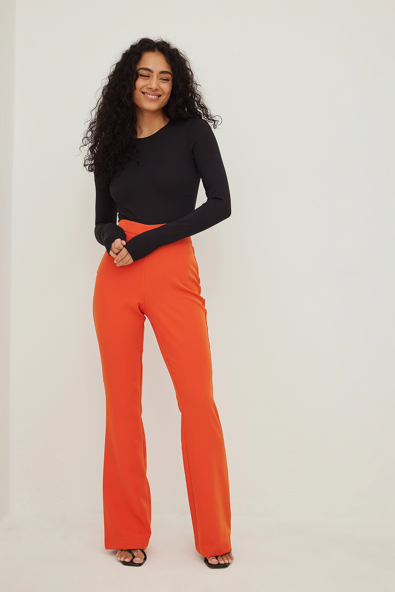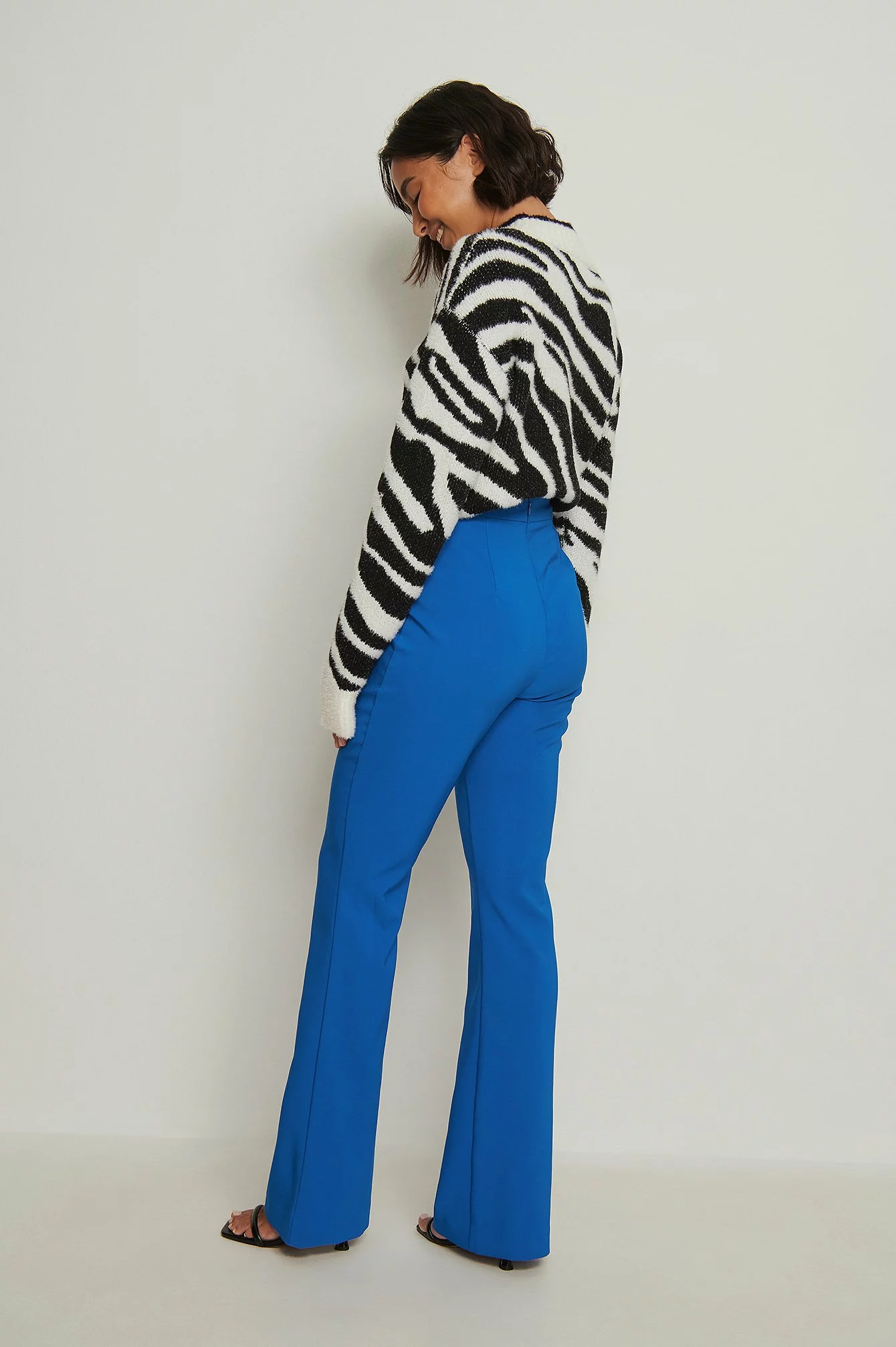 These suit pants feature a high waist, a concealed zipper closure on the back, a v-shaped detail at the waist and long wide legs.
