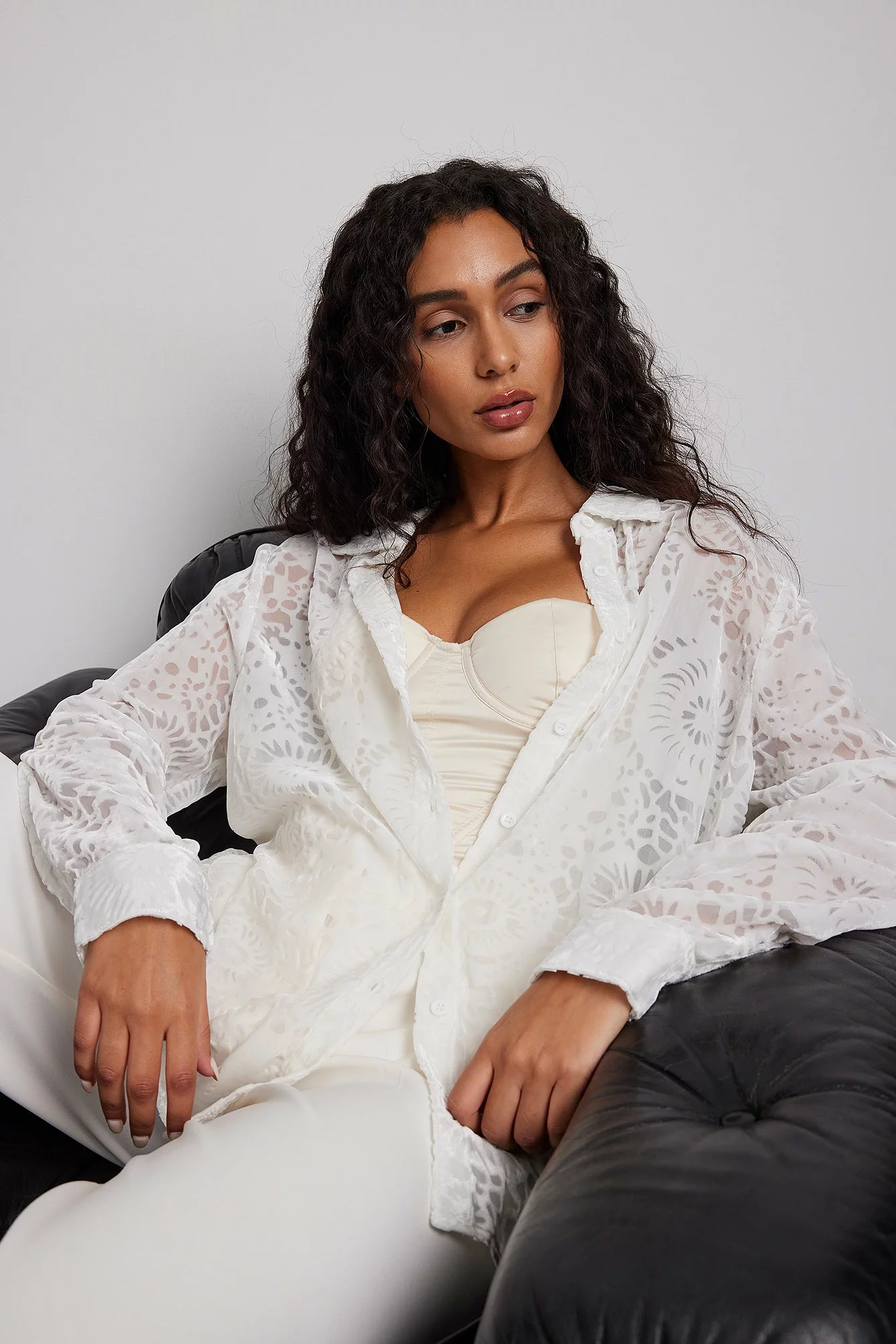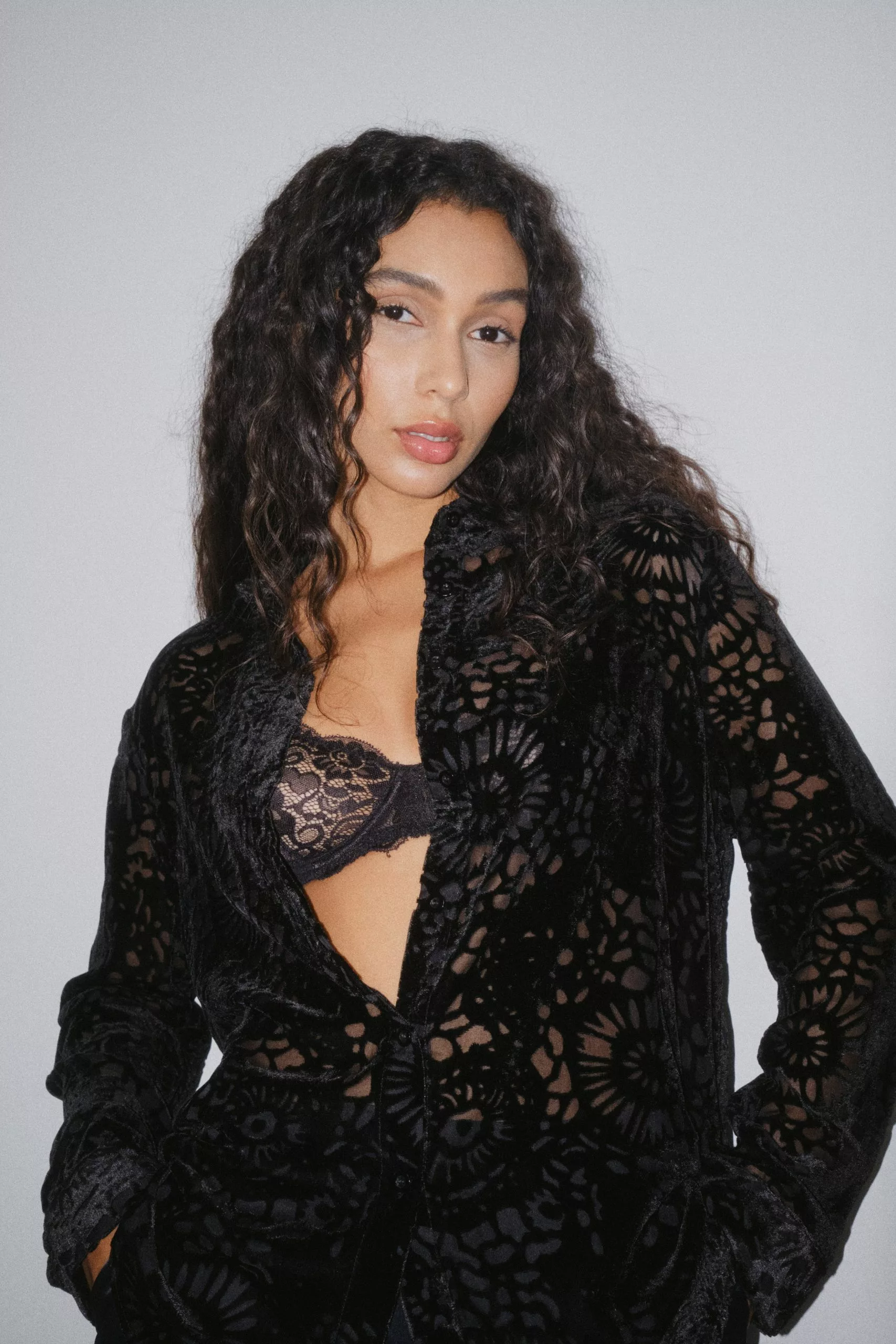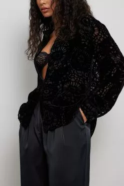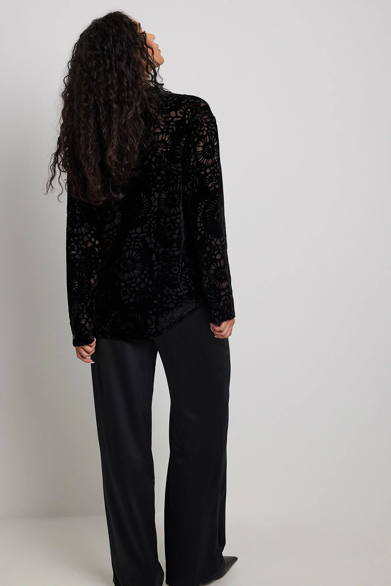 This shirt is velvety and features a long sleeve. It has a mesh design and a button closure.