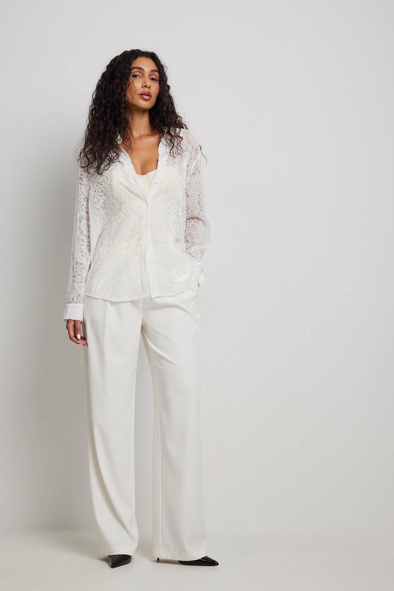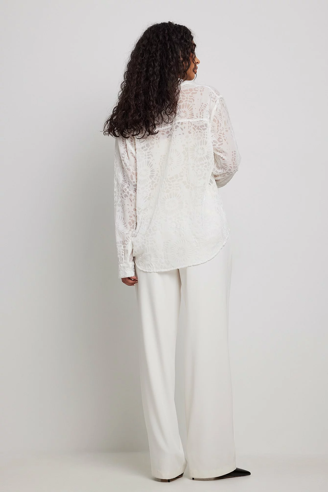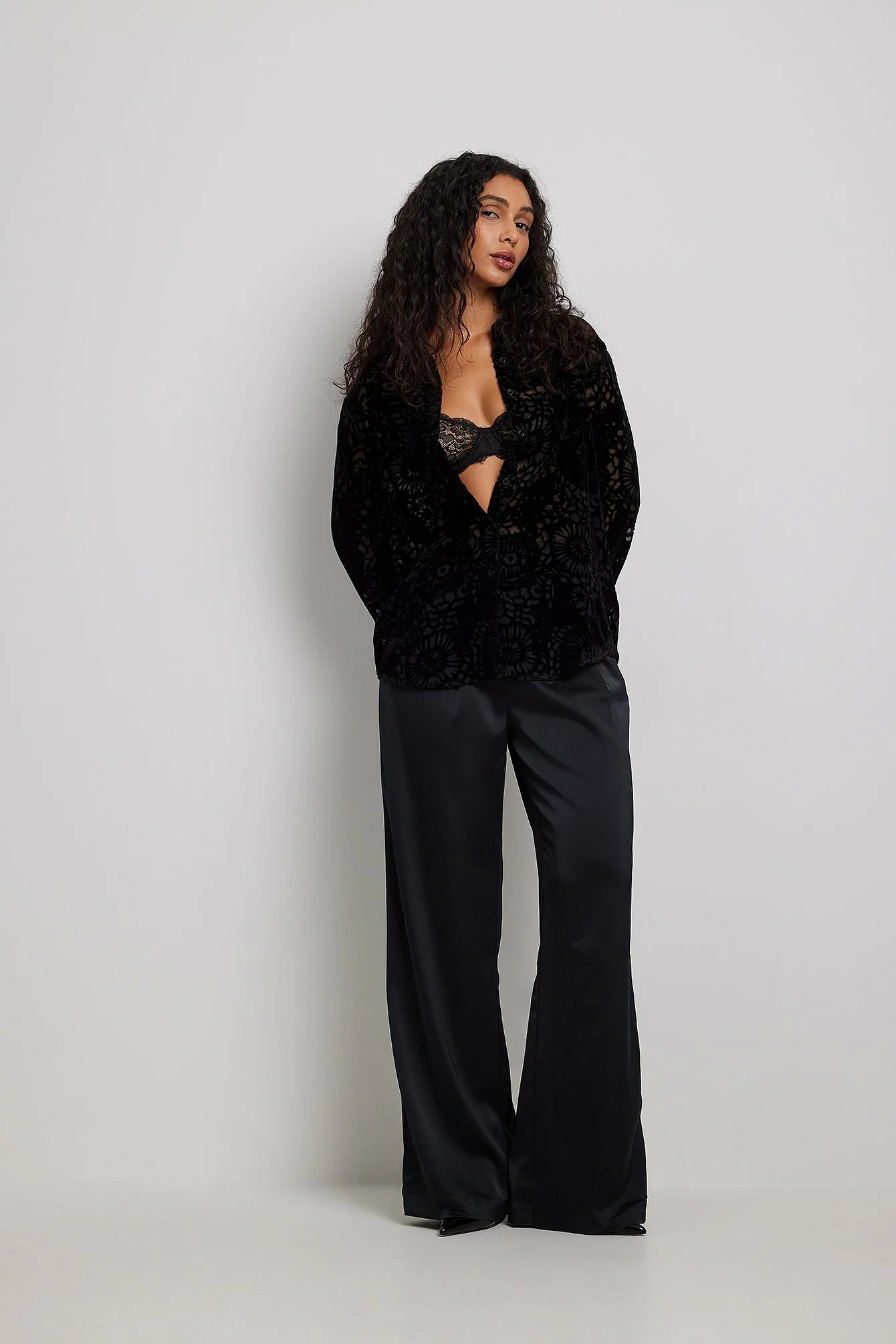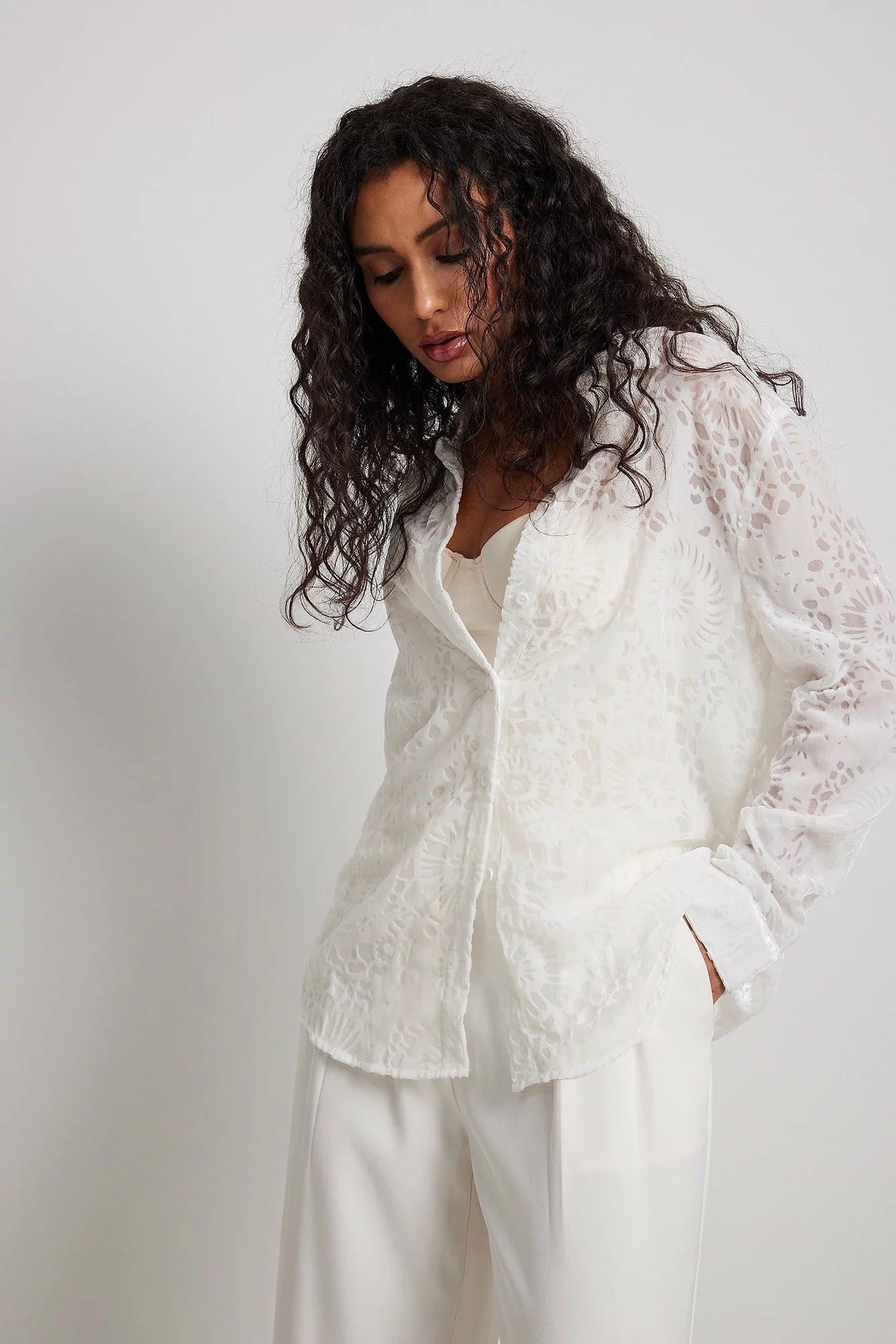 This shirt is velvety and features a long sleeve. It has a mesh design and a button closure.
