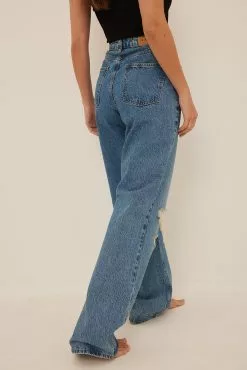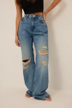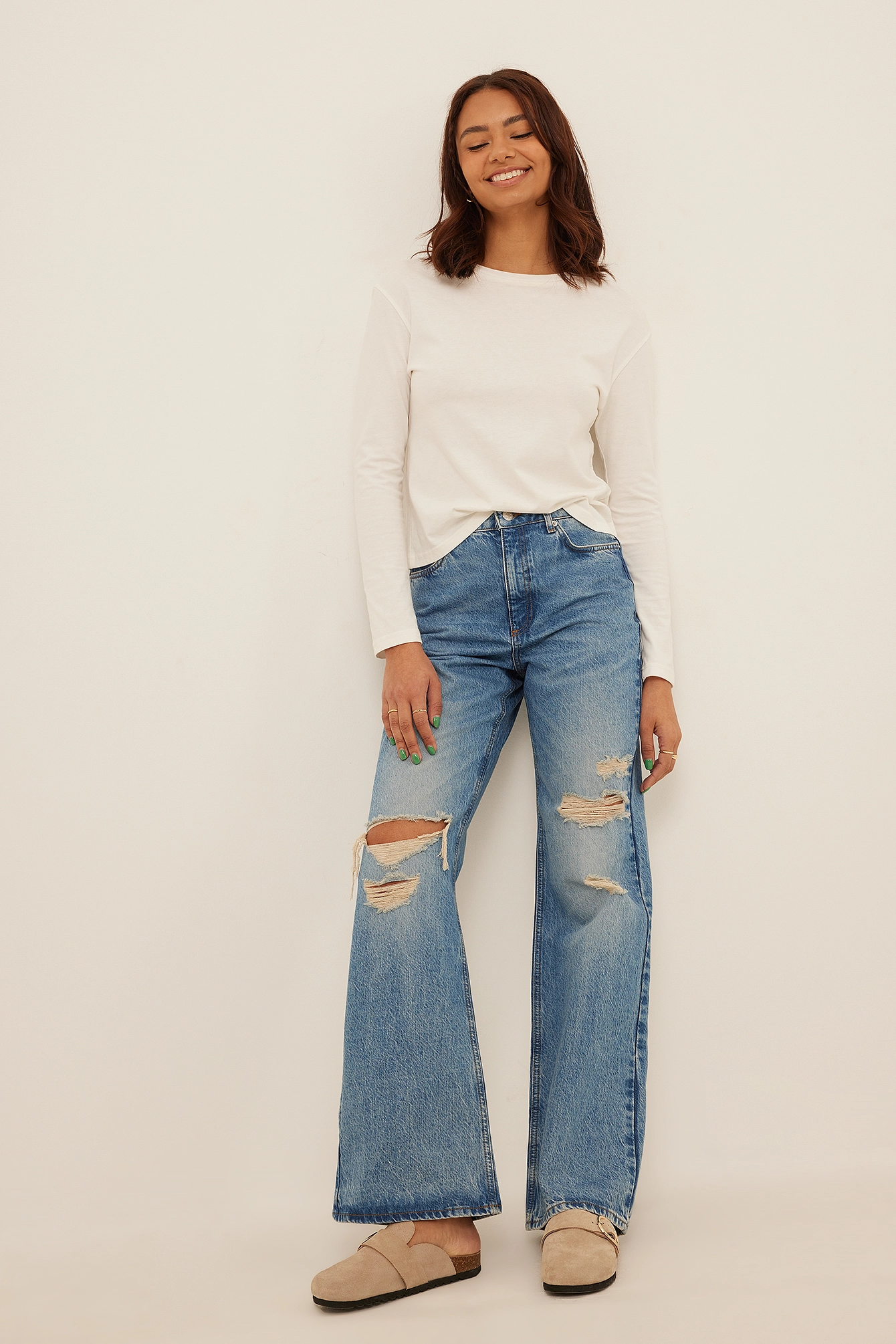 These jeans feature a high waist, a five-pocket design, wide legs and distressed details at the knees.