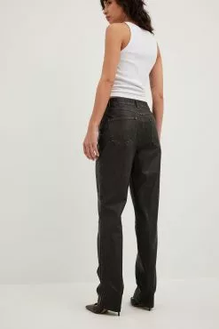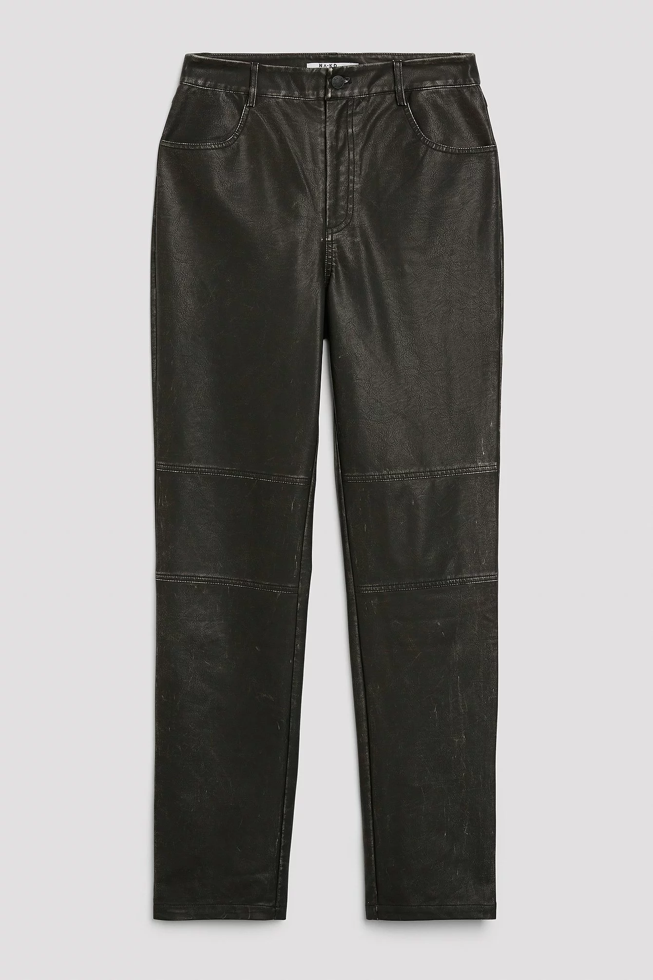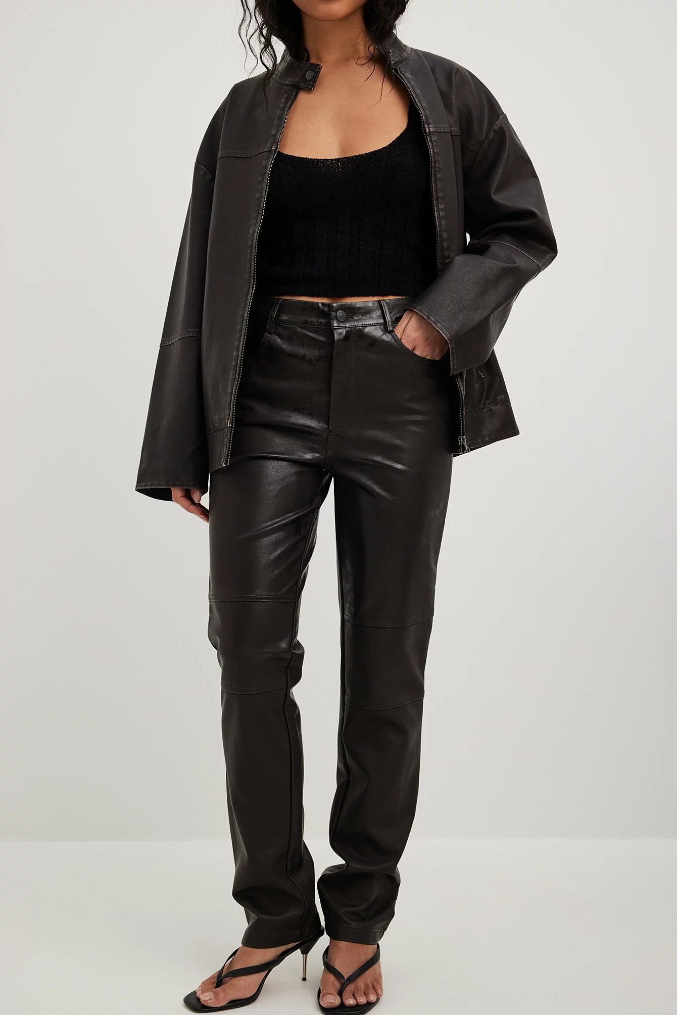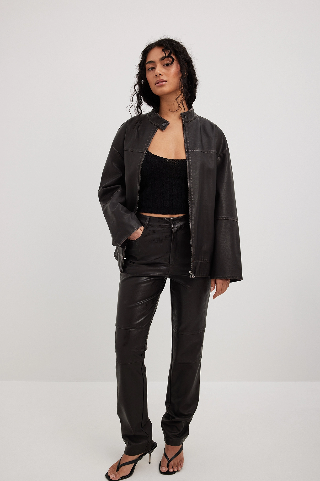 These pants are made of PU and feature a worn-out look. They have a straight leg and a zipper and button closure. These pants feature seam details at the knees. Inseam length in size 36: 80 cm / 31.49 in.