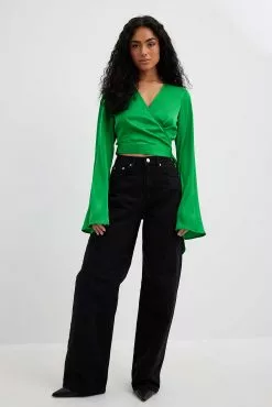 This blouse features a satin touch. It has a wrap design with a self-tie band and long trumpet sleeves.