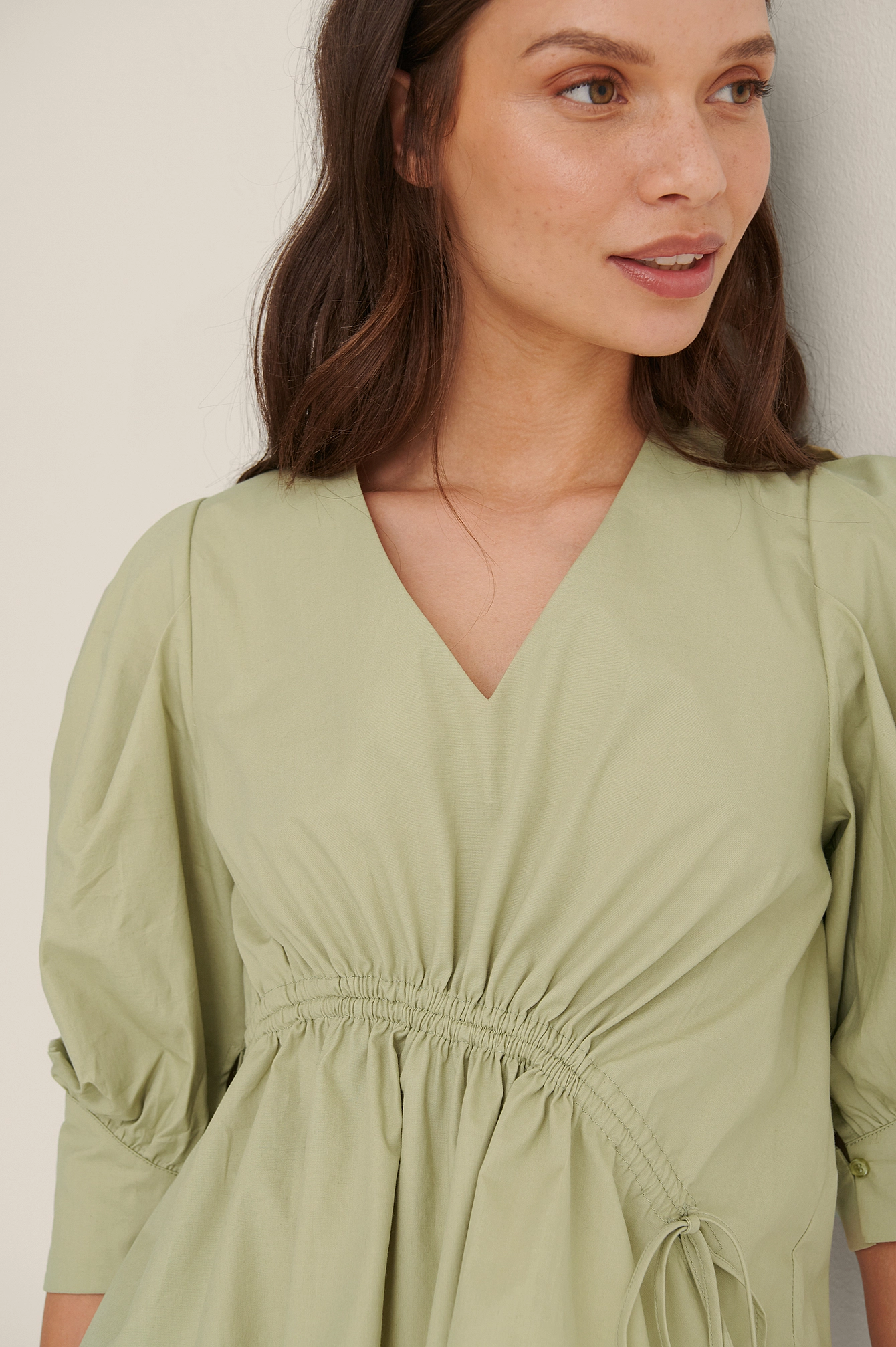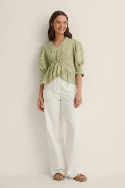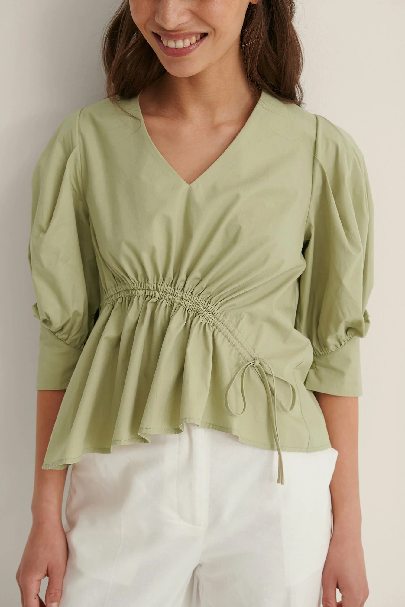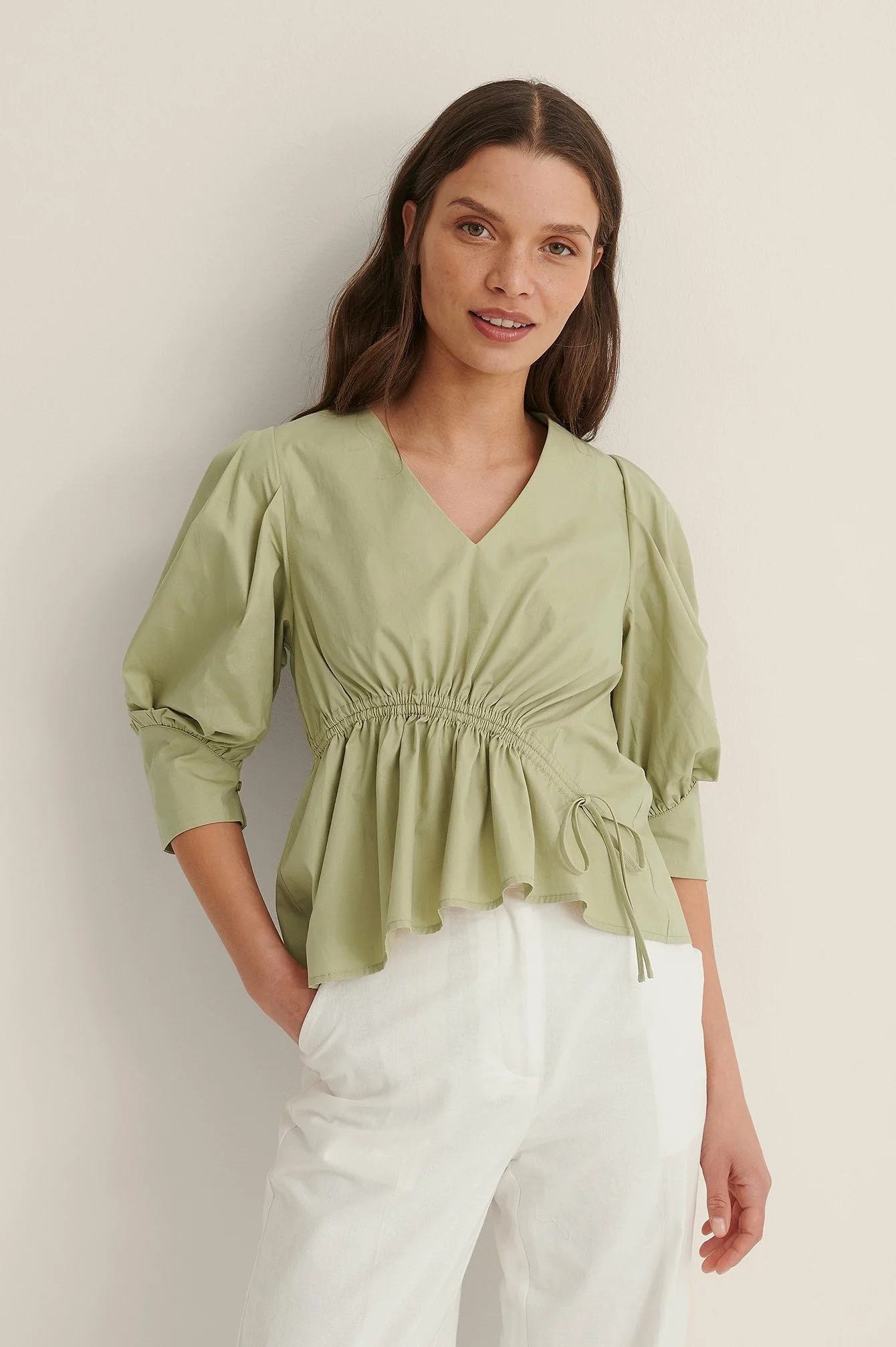 This blouse features a v neckline, a drawstring detail at the waist and short sleeves.