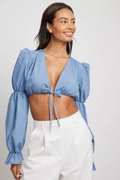 This blouse is cropped and features long sleeves with ruching at the shoulders and elasticized, gathered details. It has a self tie closure with drawstring.