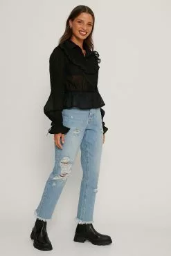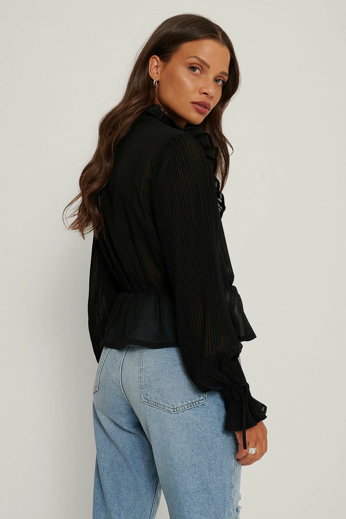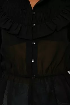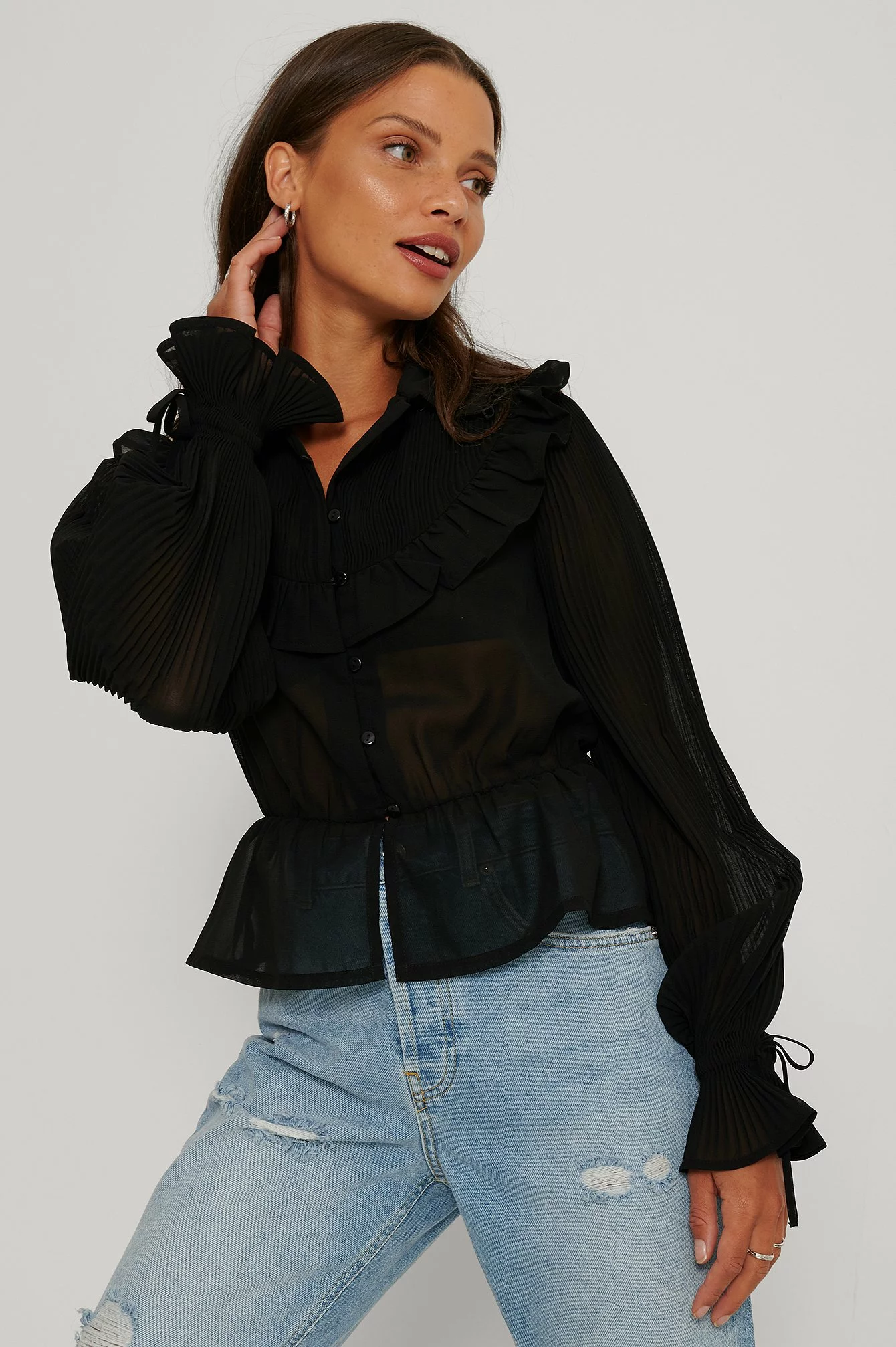 This blouse features a classic collar with lazer cut details, long sleeves with elasticized drawstrings at the cuffs, a seethrough, chiffon design with ruffled pleat details on the sleeves and at the front and an elasticized waist and a button closure along the front.