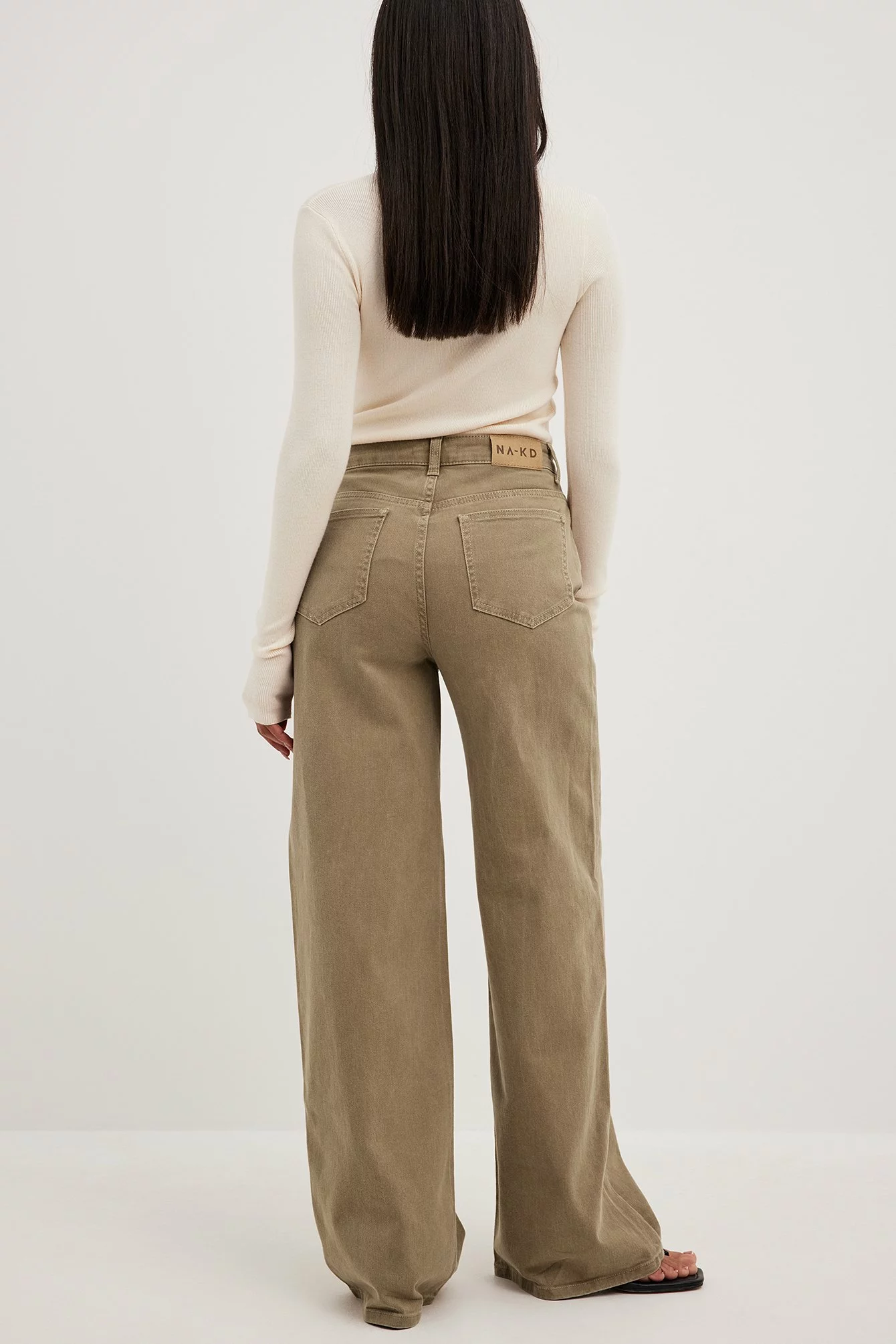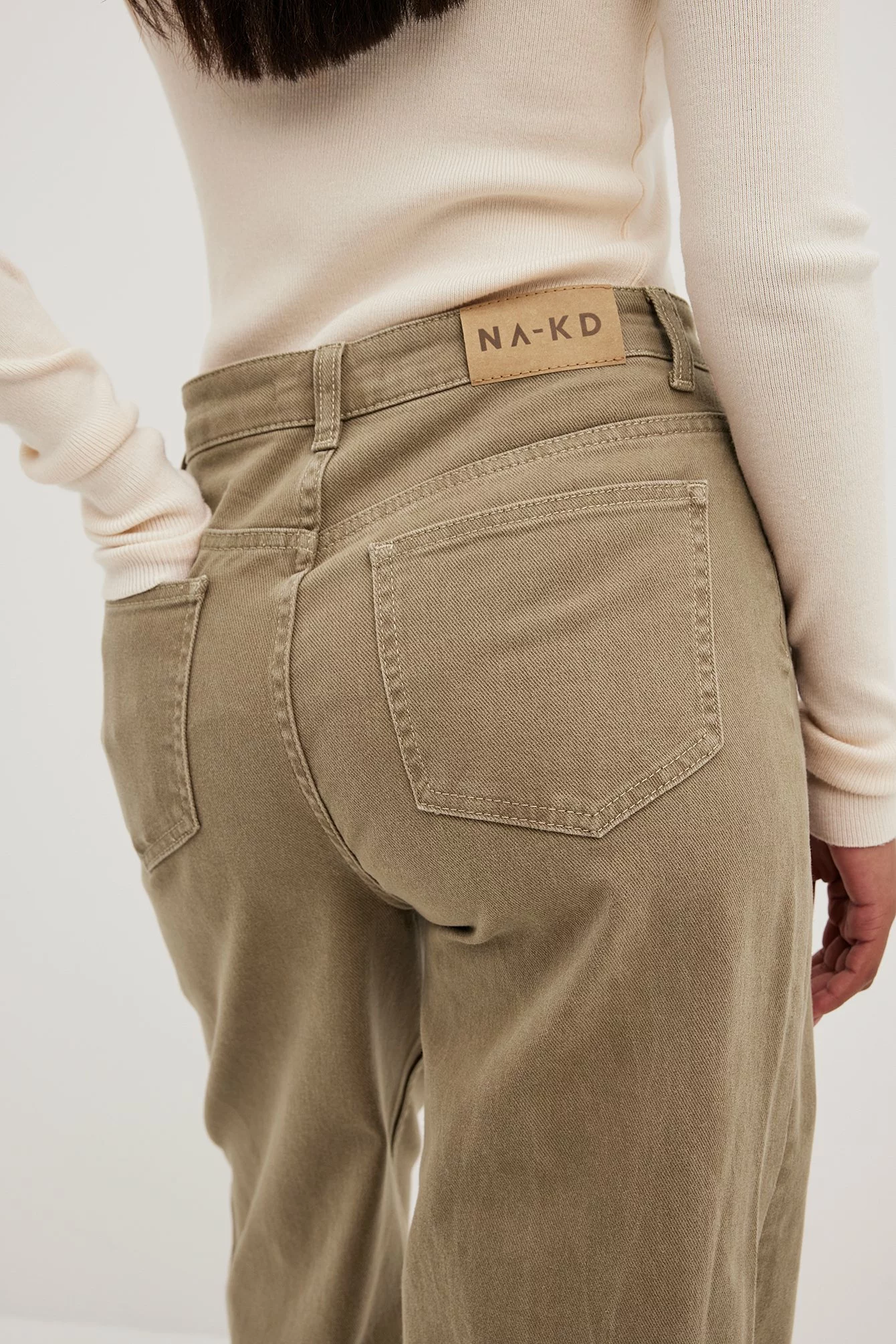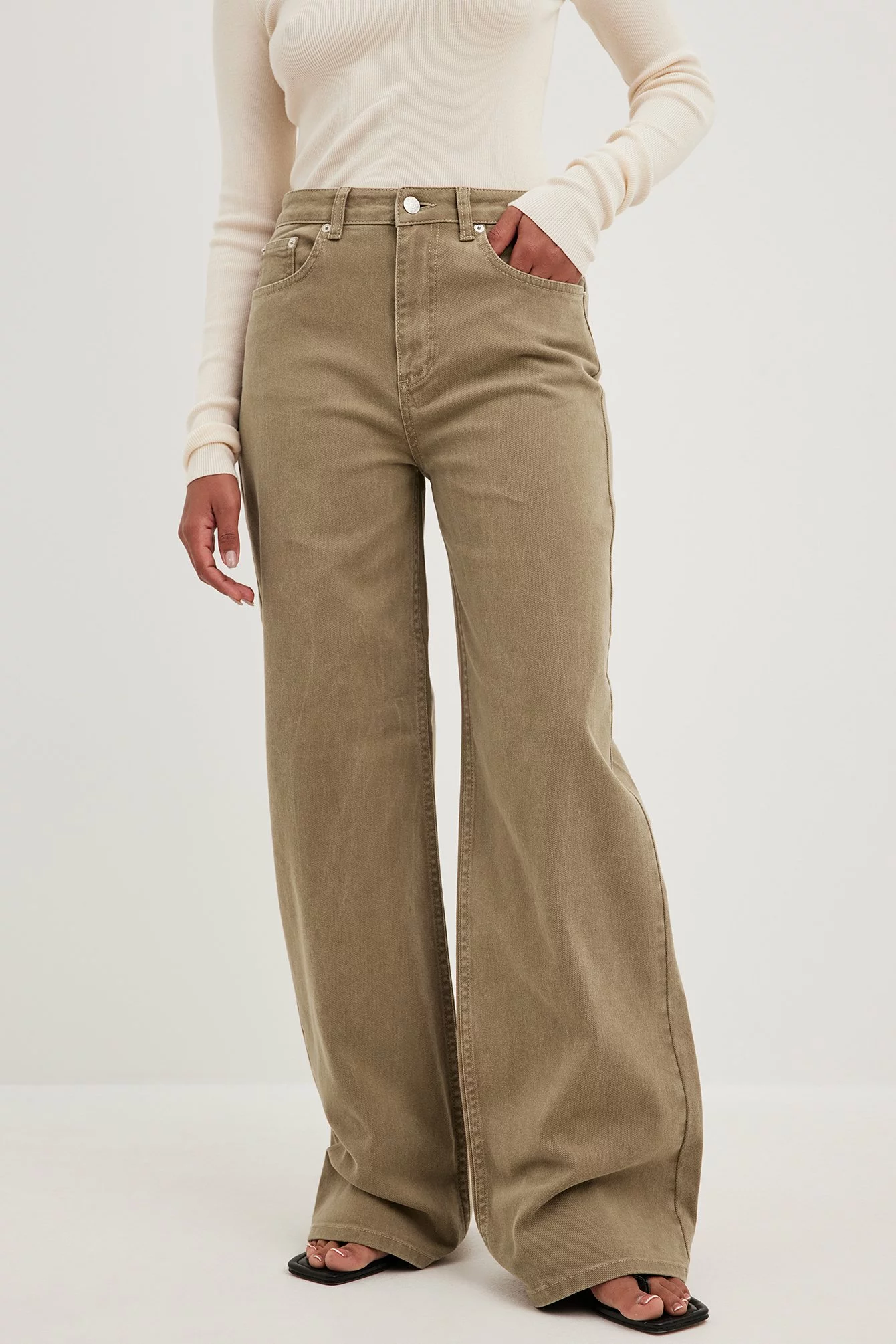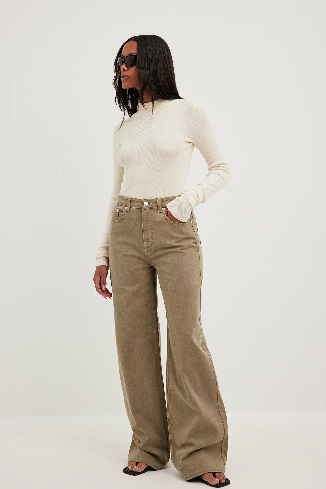These jeans feature denim material. They have a high waist fit and a wide leg. These jeans feature 5-pocket jeans.