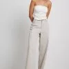 These jeans feature a high waist. They have a five-pocket design and wide legs.