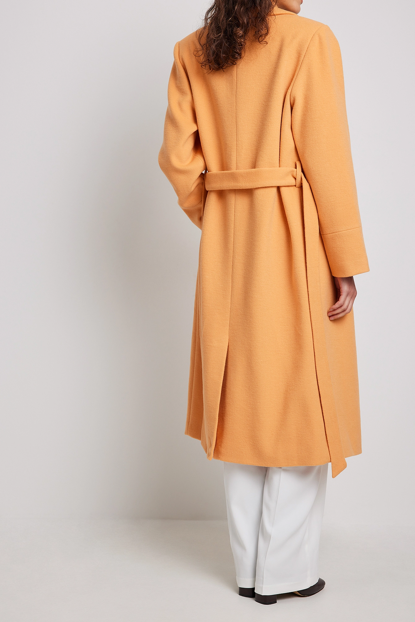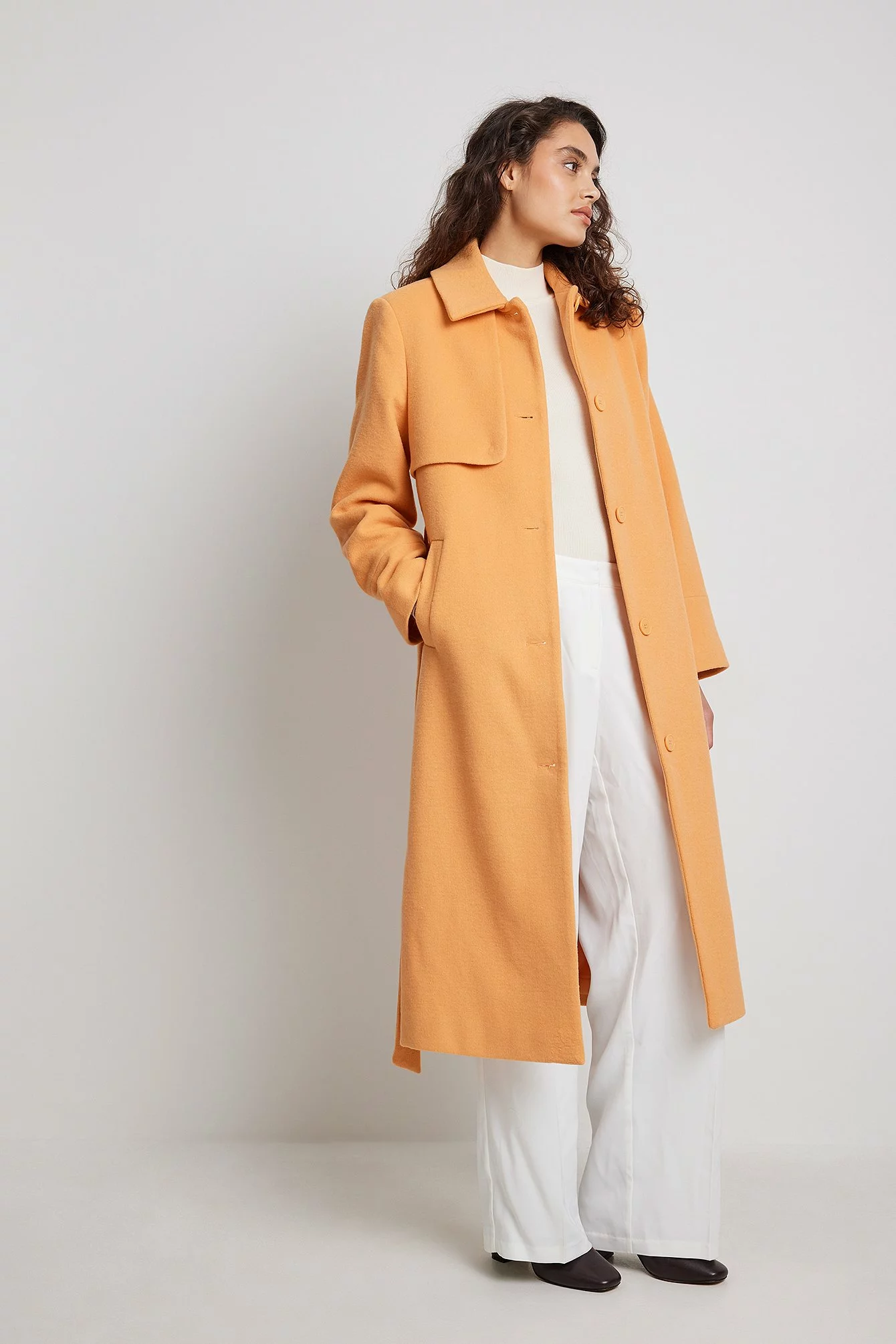 This coat is oversized and features a classic collar, a front panel detail with a snap button closure, a belt tie, side pockets, a button closure, a lining and a slit detail on the back.