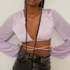 This blouse features a wrapped v neckline with a snap button closure, long sleeves with double button cuffs, cropped length, an elastic bottom hem and a structured material.