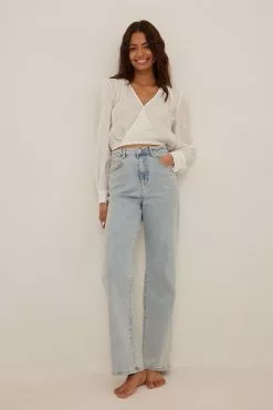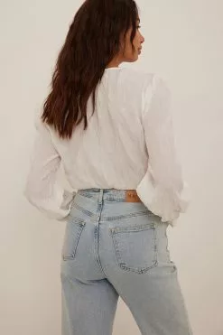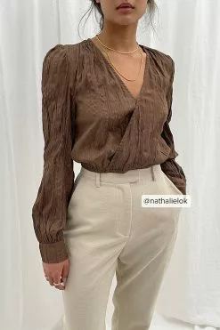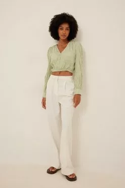 This blouse features a wrapped v neckline with a snap button closure, long sleeves with double button cuffs, cropped length, an elastic bottom hem and a structured material.
