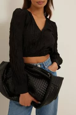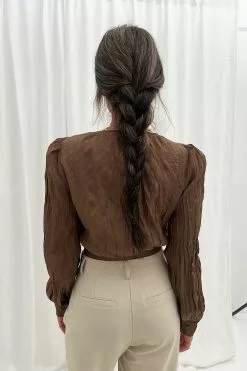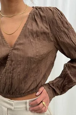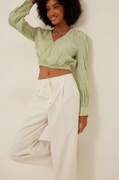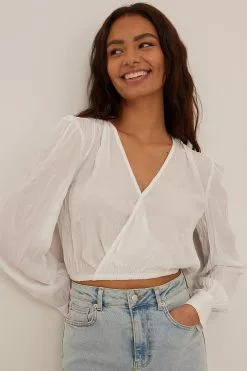 This blouse features a wrapped v neckline with a snap button closure, long sleeves with double button cuffs, cropped length, an elastic bottom hem and a structured material.
