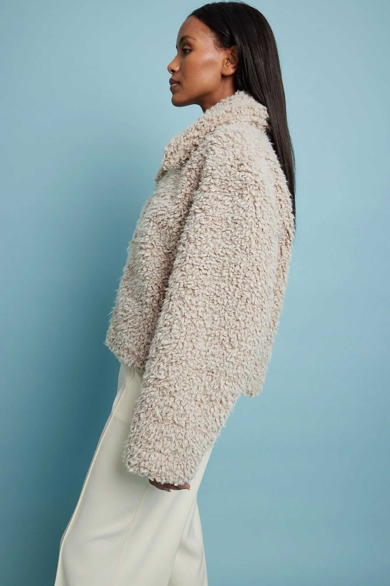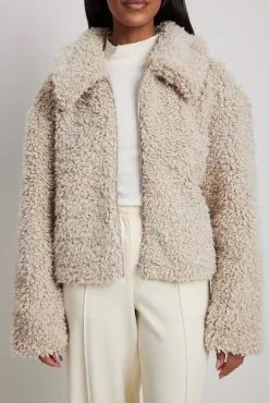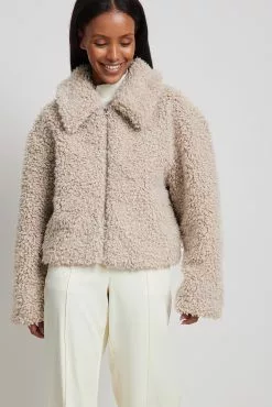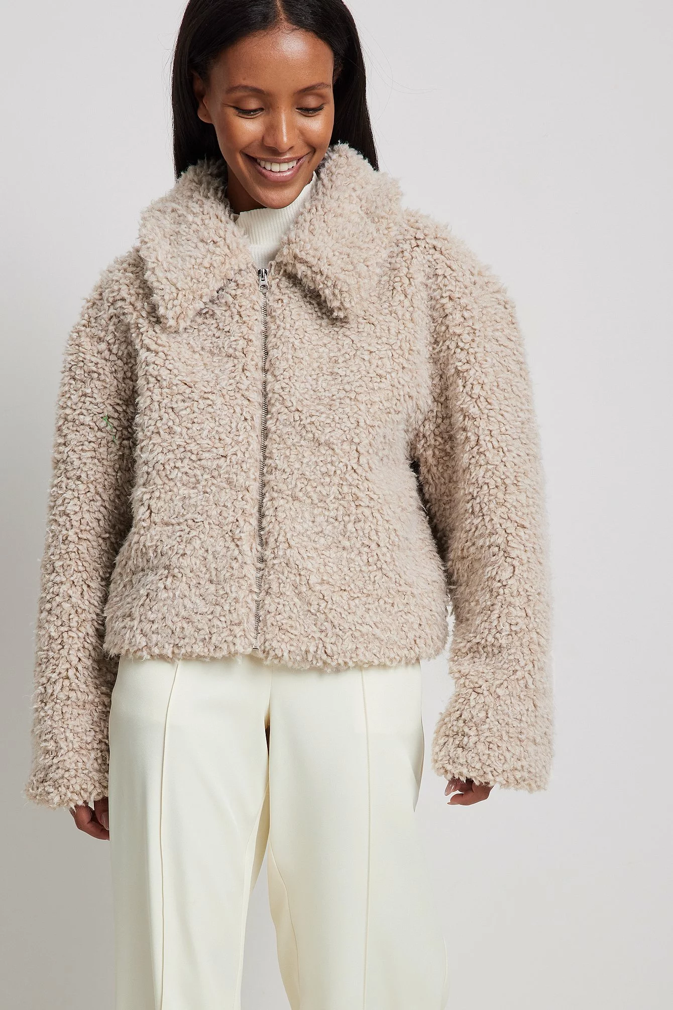 This jacket is teddy and lined and features a classic collar. It has a zipper closure and side pockets.