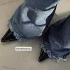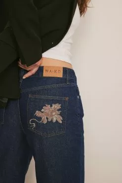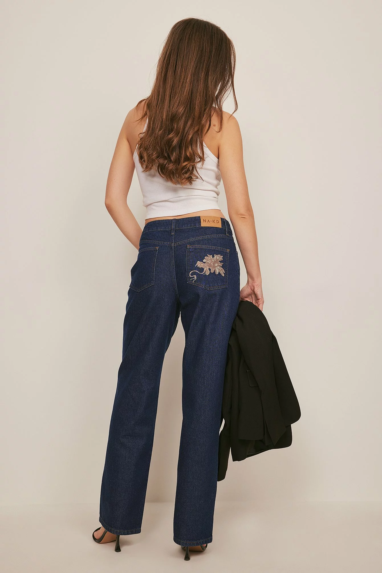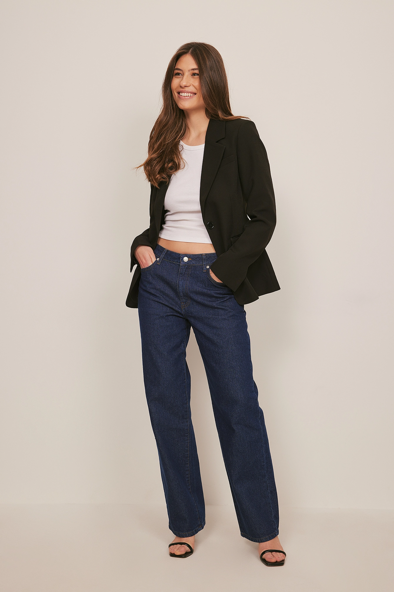 These jeans feature a high waist. They have a loose fit and a four-pocket design. These jeans feature a zipper and button closure and belt loops.