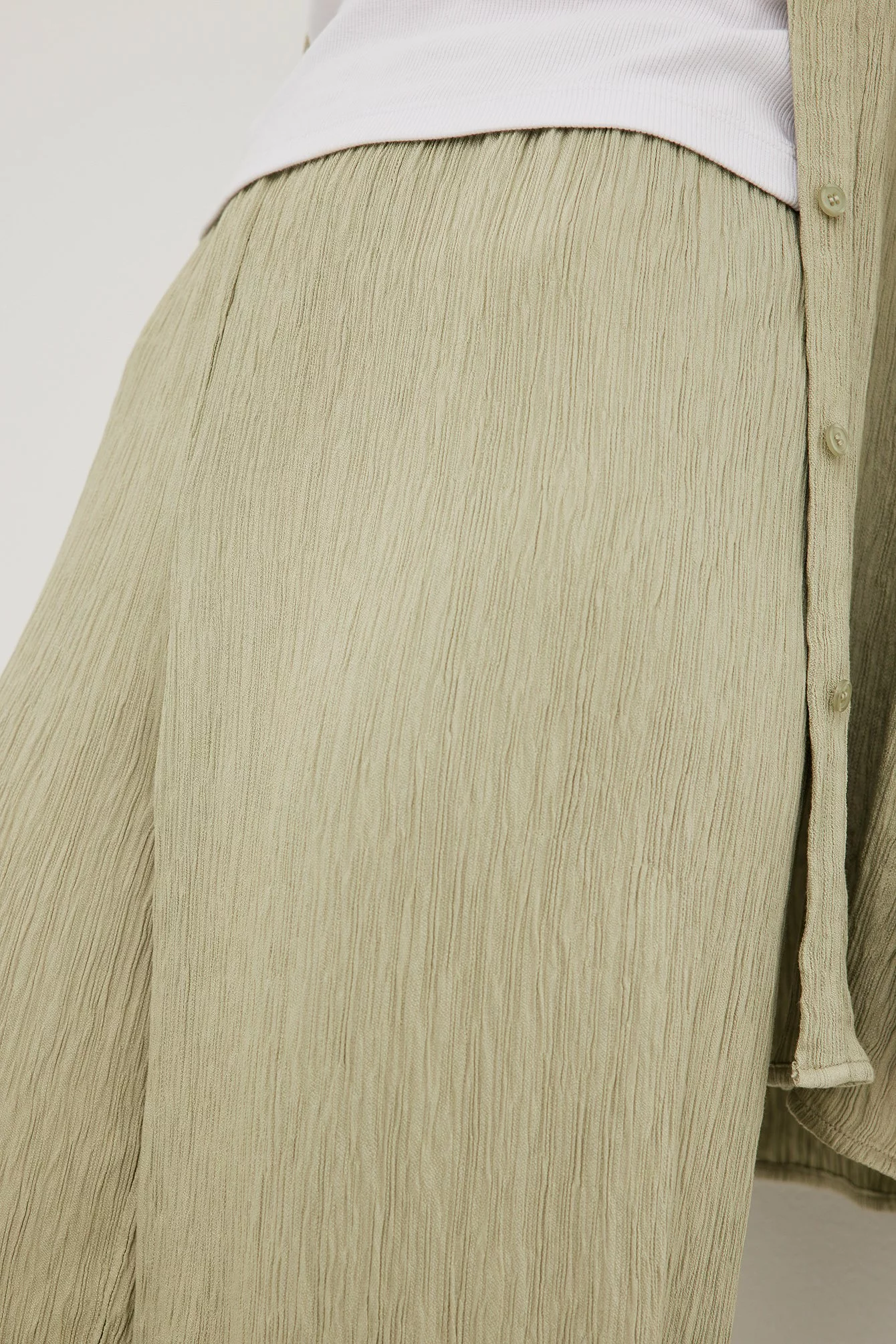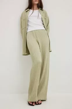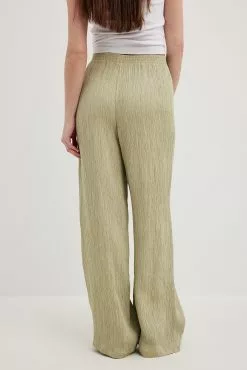 These trousers feature a structured, stretchy material and a flowy straight fit. They have a wide leg and an elasticized waist.