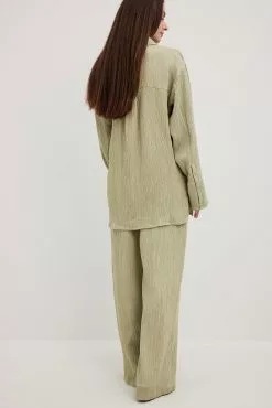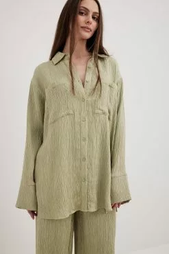 This shirt features an oversized fit and a structured, stretchy material. It has chest pockets with snap button closure and triple button cuffs. Our shirt features small side slits, a button closure down the front and a pleat detail on the back.