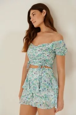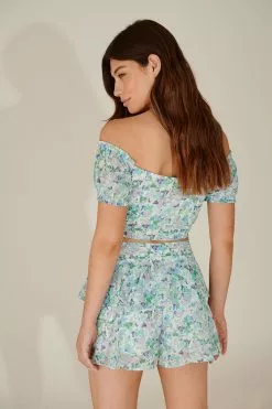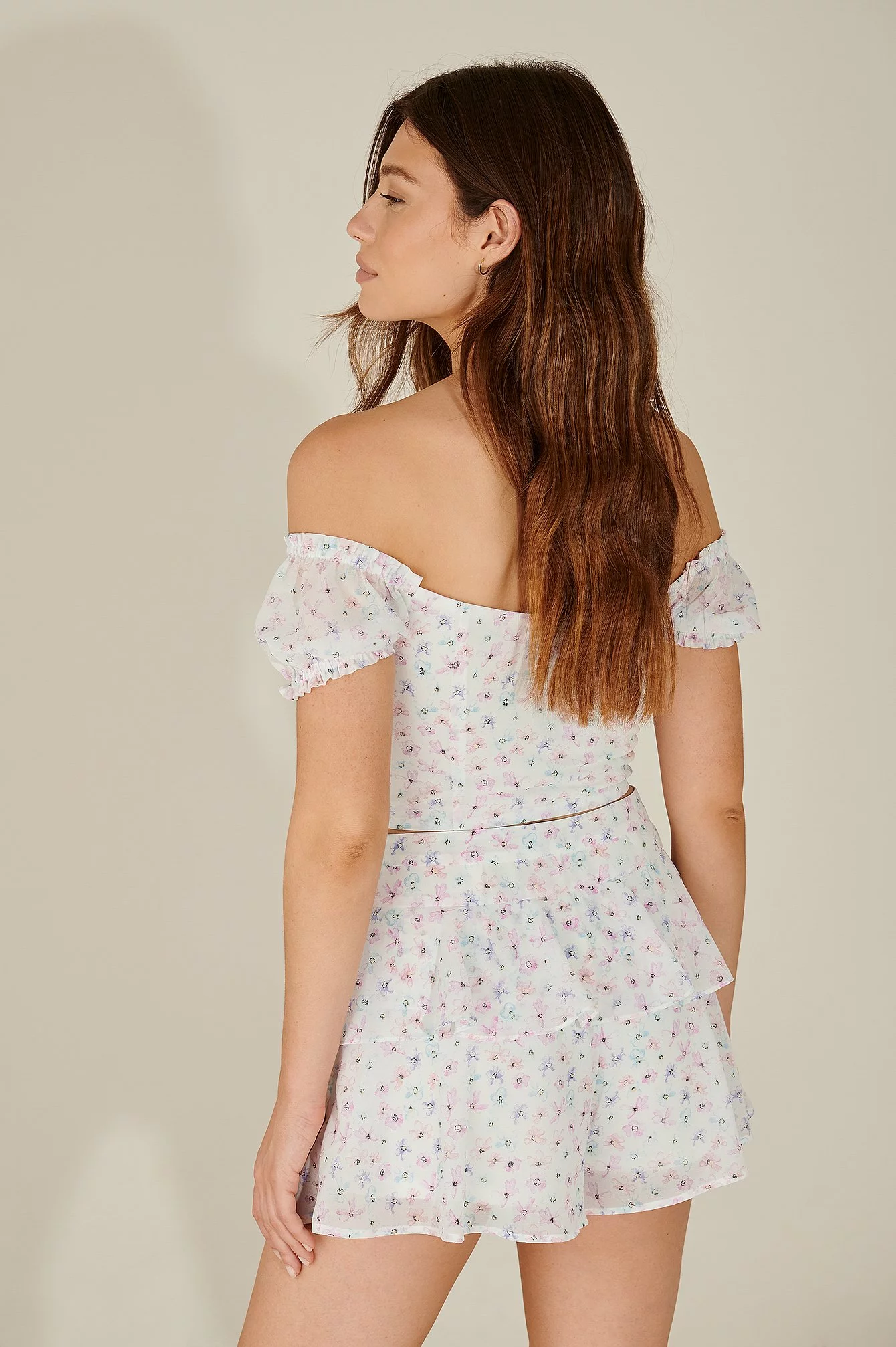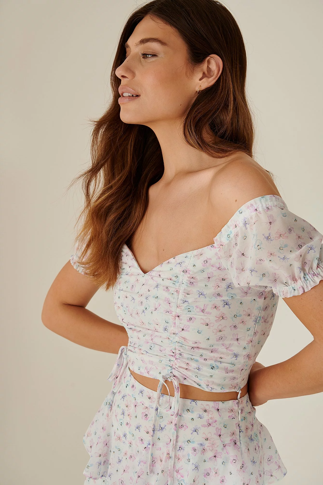 This top features a heart-shaped neckline, an off shoulder look with slightly transparent puff sleeves and elasticated bands, a side zipper, an inner silicone trim on the back, two adjustable drawstring details at the front, underlining and cropped length.