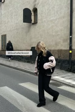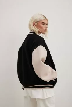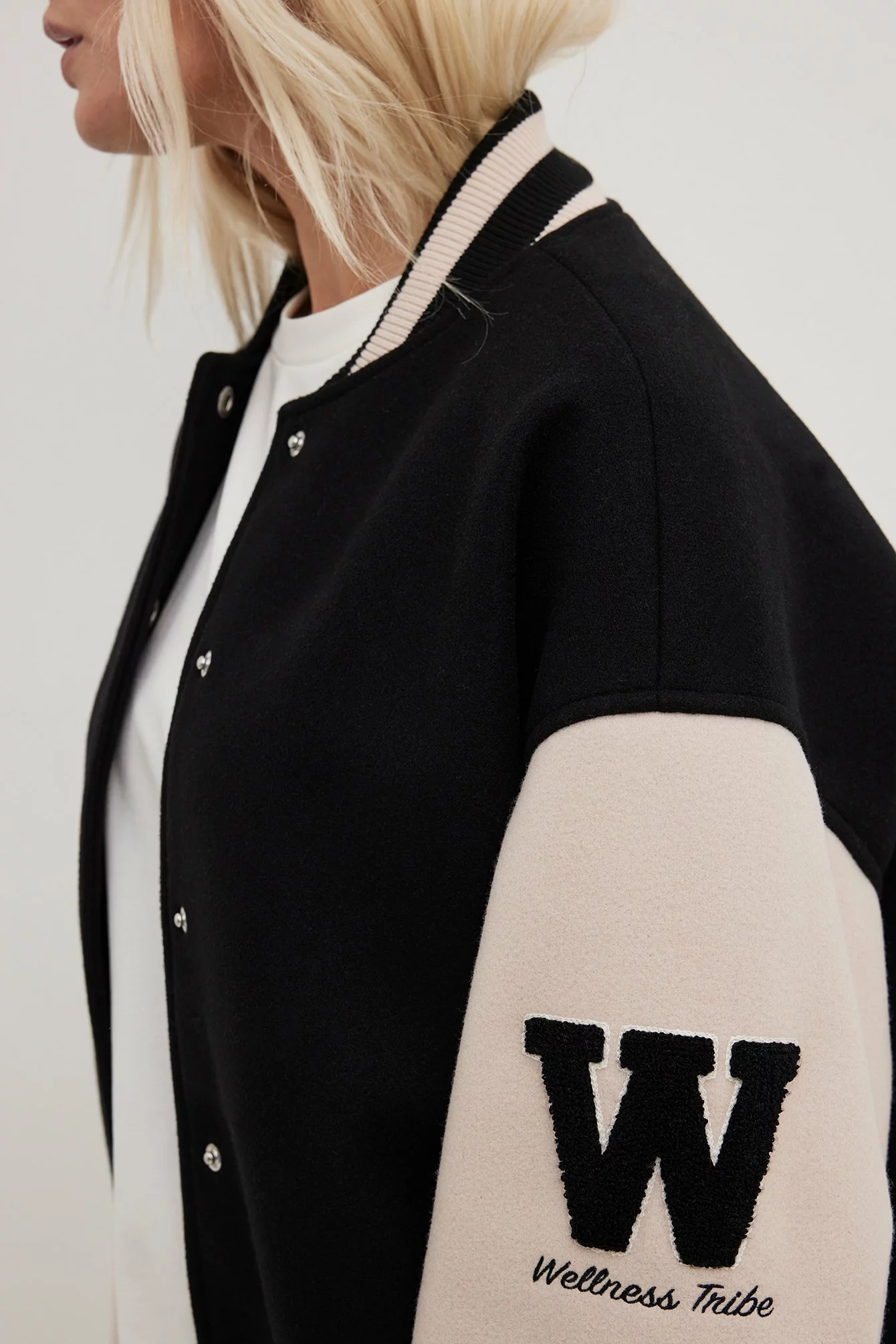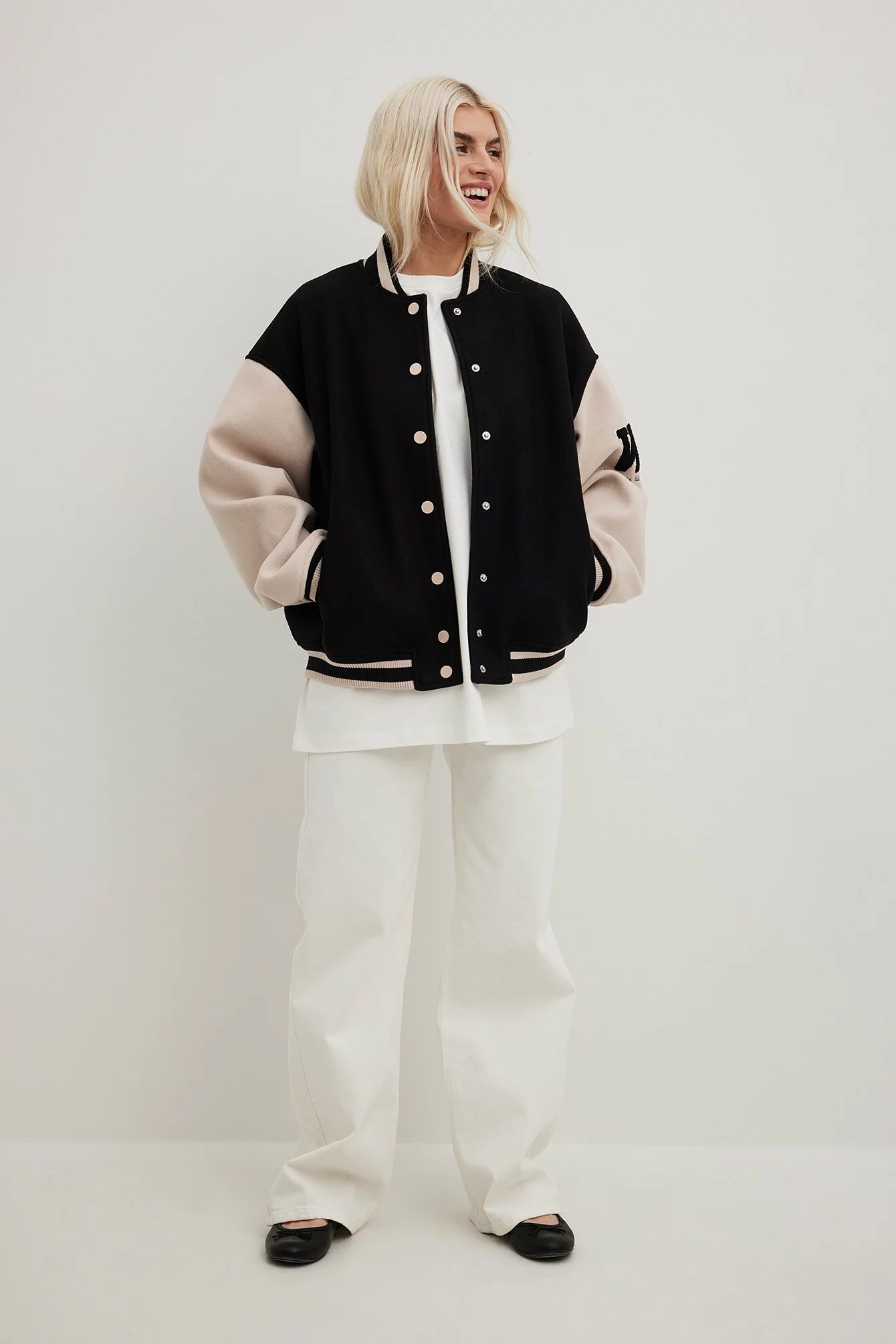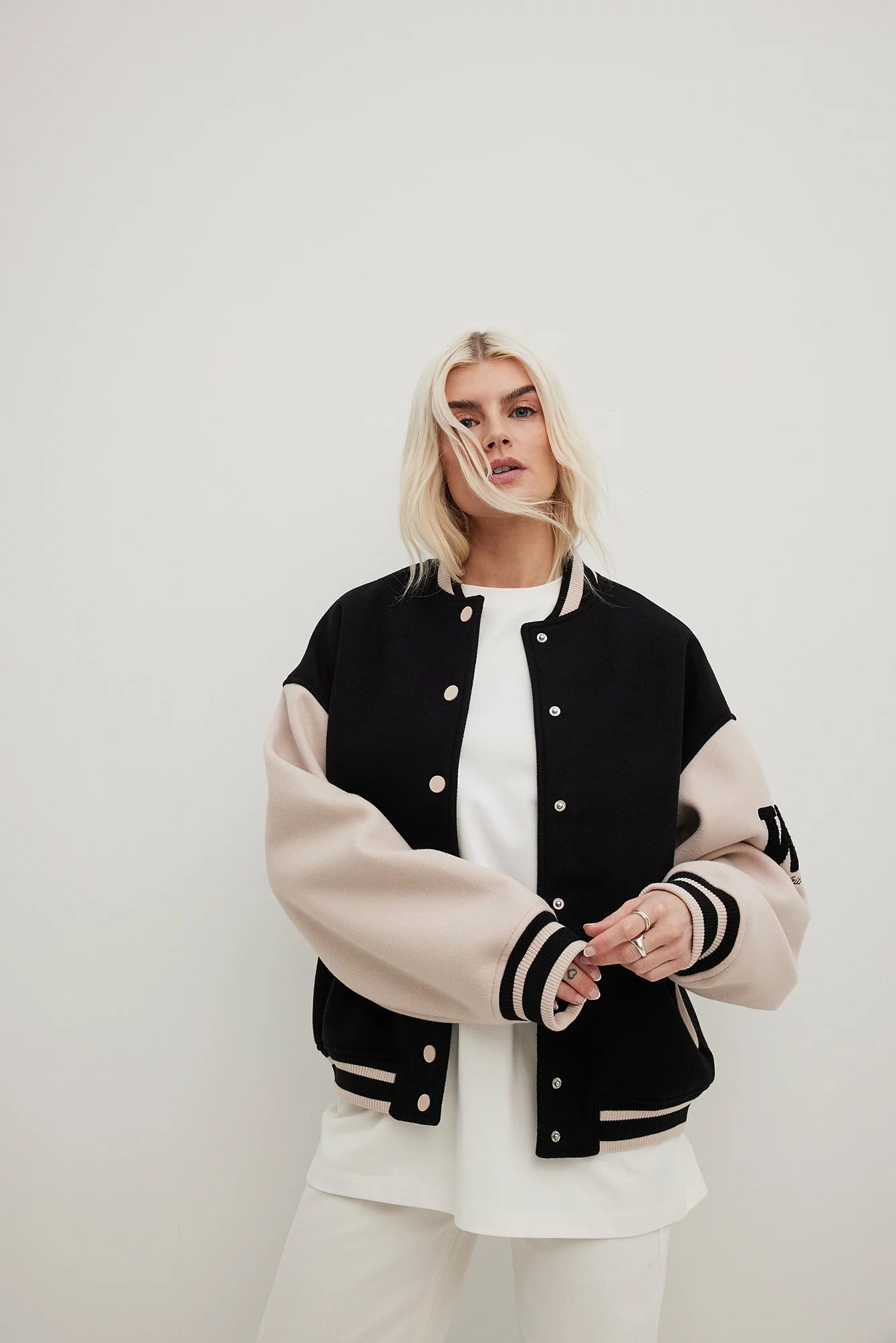 This bomber jacket is oversized and made of felt and features a contrast-colored design. It has ribbed trims and a snap button closure. This bomber jacket features long sleeves with embroidery on one sleeve, side slanting pockets and a lining.