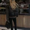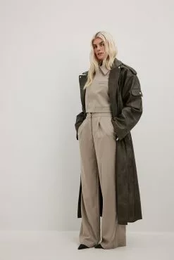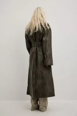 This coat is made of PU and features a maxi length and a lapel neckline with snap buttons. It has seam details at the shoulders, strap details at the shoulders with a snap button closure and long sleeves with zippers. This coat features a zipper closure with an overlap design, side pockets with a zipper closure, a slit detail on the back and a lining.