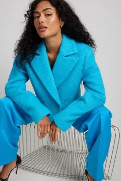 This coat is pocketless and features a cropped design. It has padded shoulders and a hidden snap button closure.
