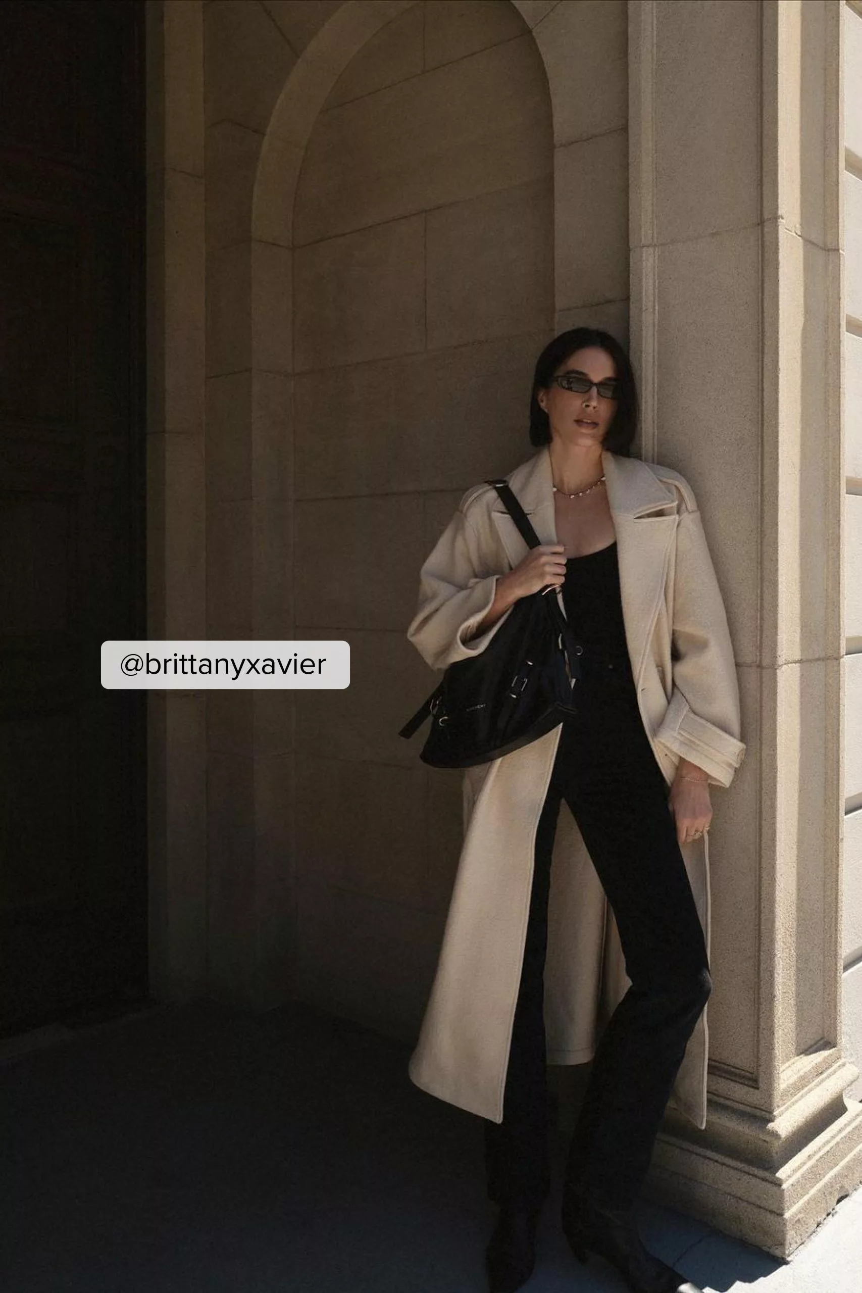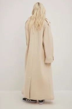 This coat is made of wool blend and features an oversized fit. It has a lapel design and long sleeves with a buckle detail. This coat features a double-breasted button design and patched front flap pockets.