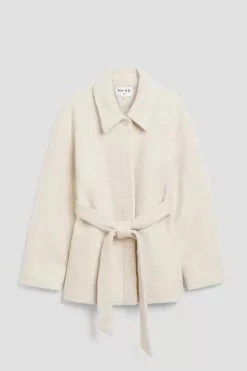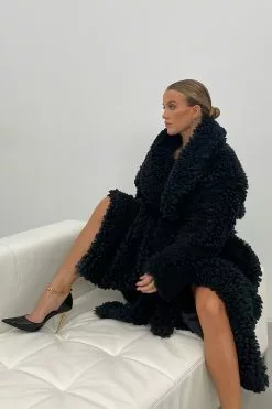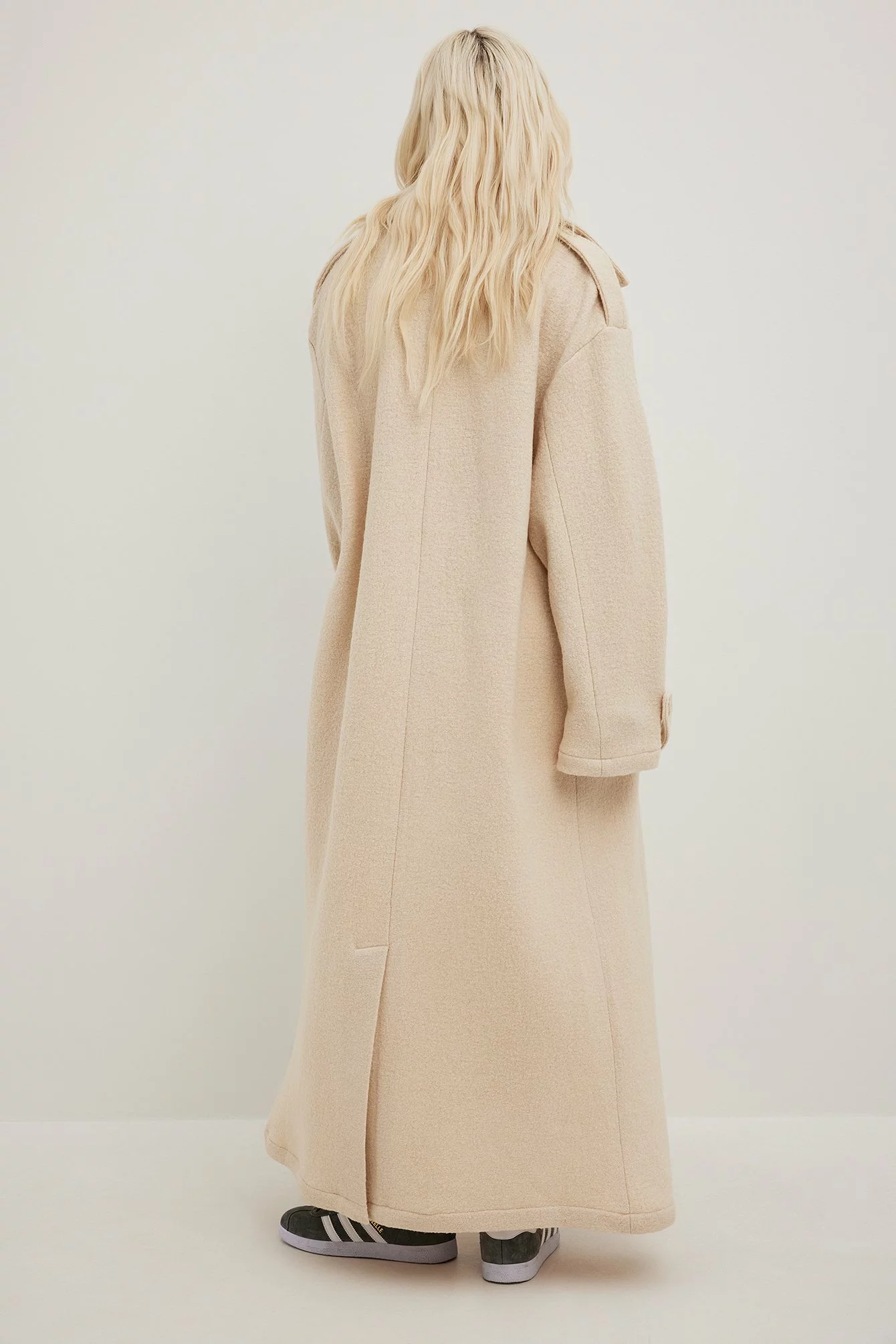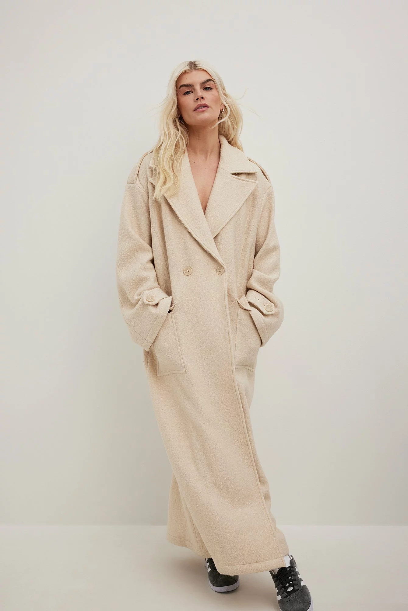 This coat is made of wool blend and features an oversized fit. It has a lapel design and long sleeves with a buckle detail. This coat features a double-breasted button design and patched front flap pockets.