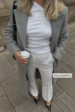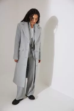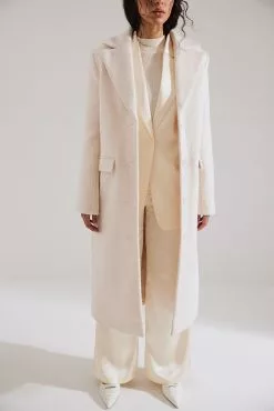 This coat features a maxi length. It has a straight fit and a fabric lining. This coat features button closures down the front, button cuffs and two front flap pockets.