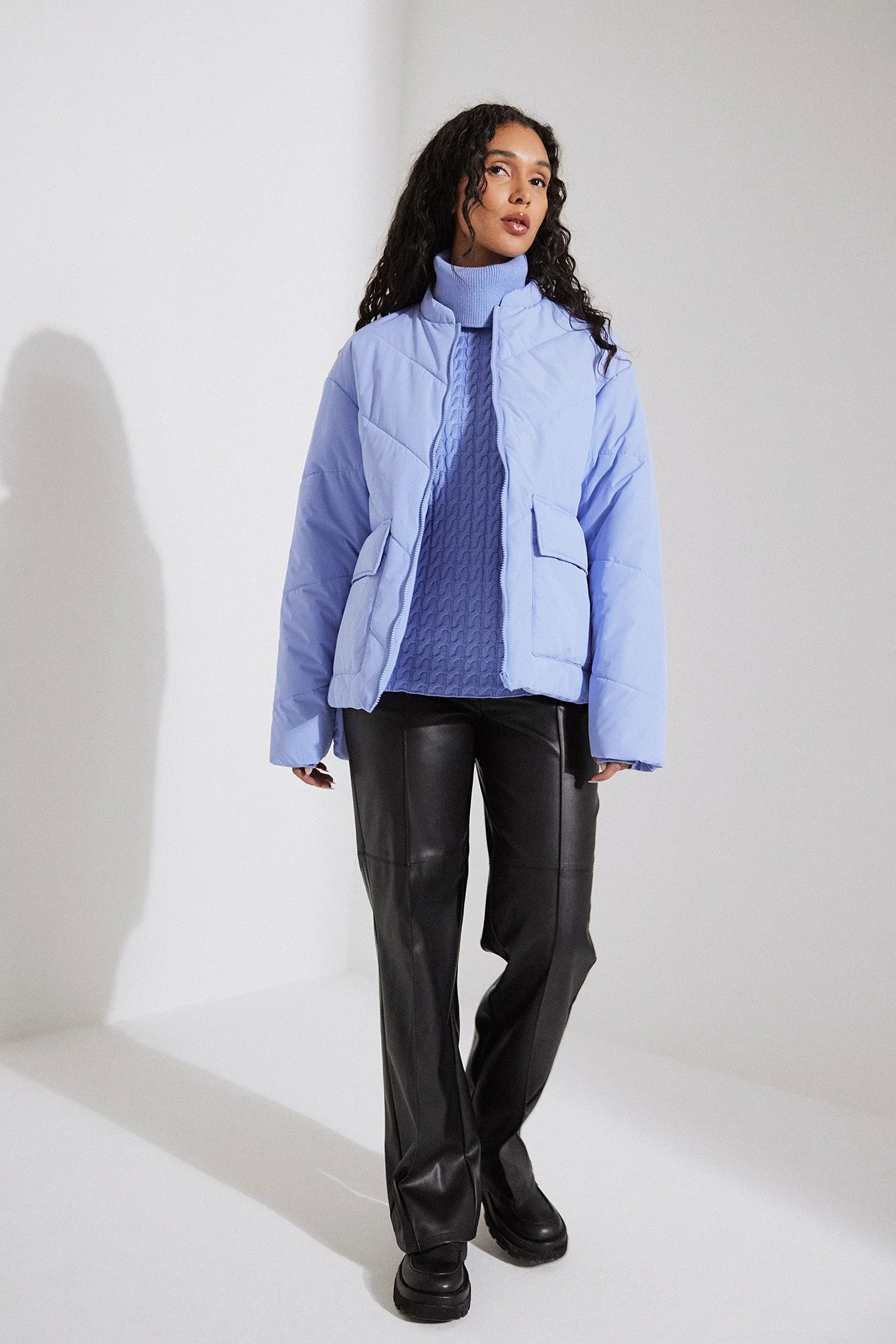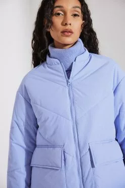 This padded jacket features an oversized fit. It has a quilted material and a high round neckline. This padded jacket features two front flap pockets and slit details on the sides.