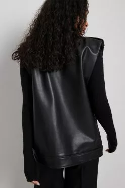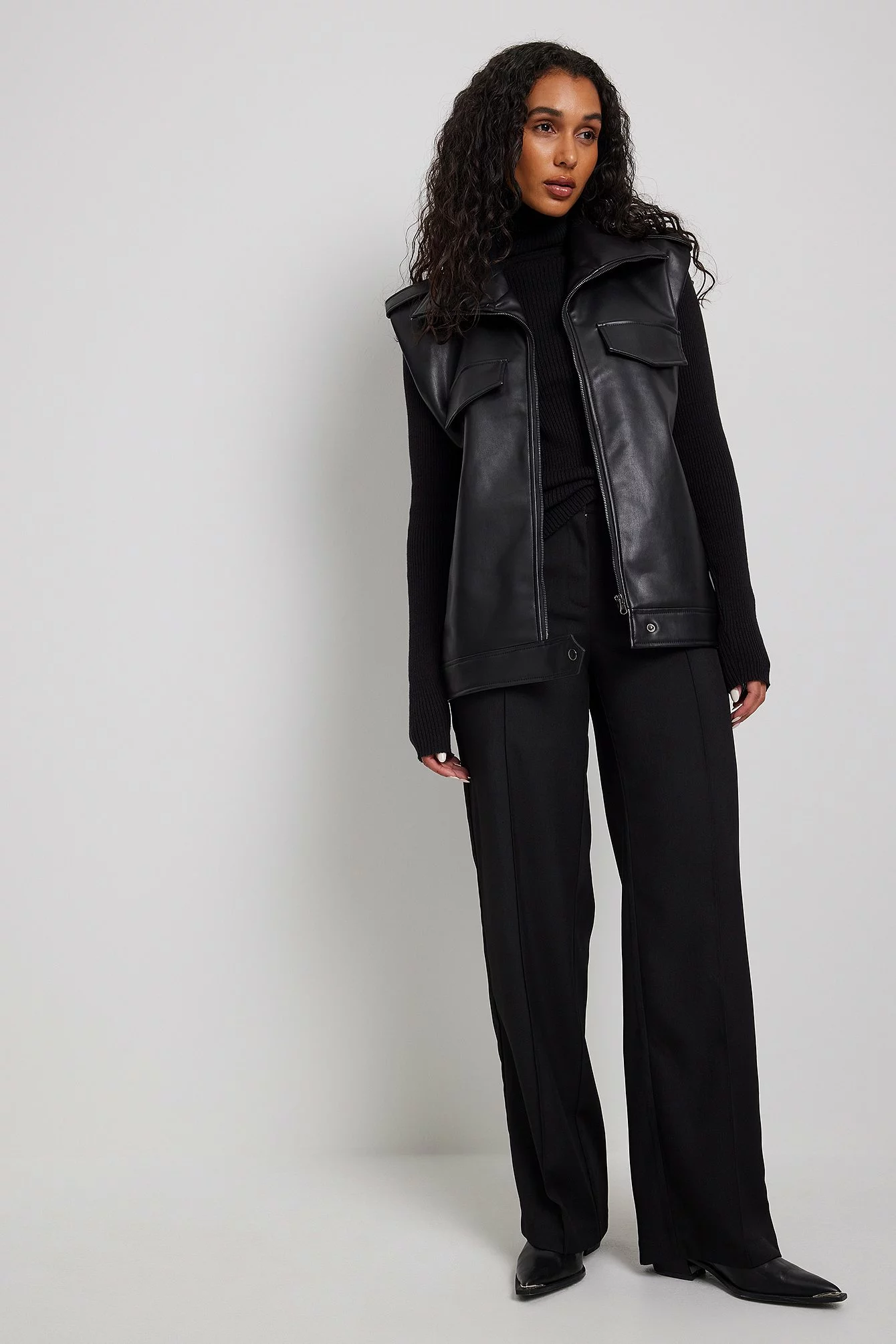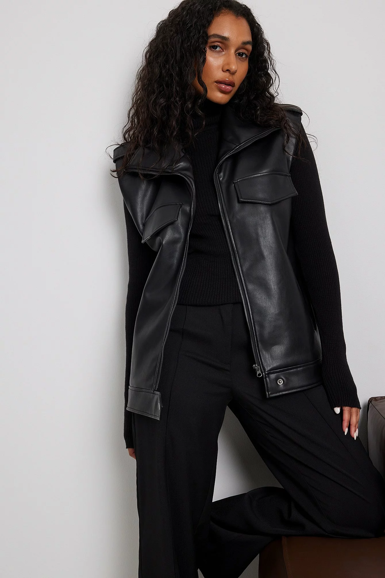 This vest is made of PU and features a high collar with a zipper along the front, a snap button on the bottom, an embellishment at the shoulders, two flap pockets on the chest and open side pockets.