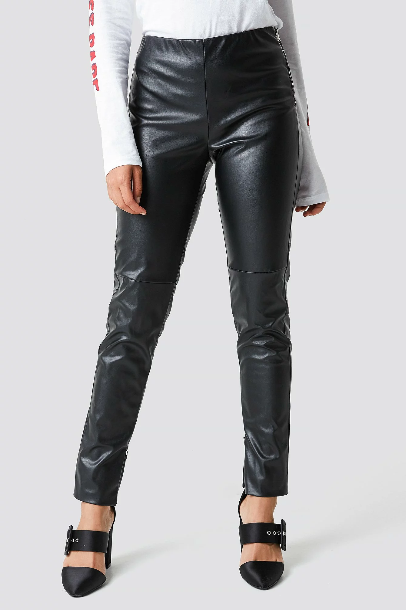 The Kelly Pu Pant by Rut&Circle features a high waist, a tailored fit, a leather-like material, a zipper detail on one side, and a stretchy waistband.