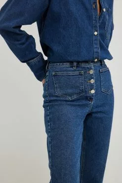 These jeans are boot cut and feature a high rise fit. They have a visible button closure and patched front pockets.