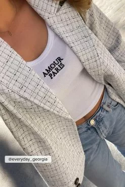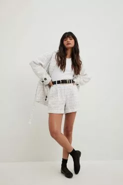 This jacket features tweed material. It has a lapel neckline and an overlap detail with a self-tie knot and a concealed button closure. This jacket features one front flap pocket with a button closure, an inner pocket, button closure on the bottom and a lining.
