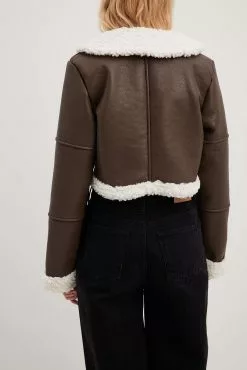 This jacket is fitted and features cropped length. It has a faux leather material with trims in faux shearling and a lining in faux shearling. This jacket features a zipper closure.