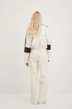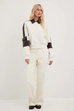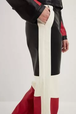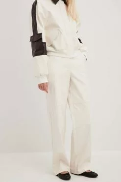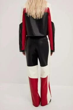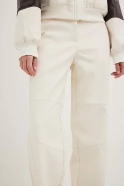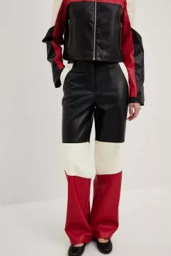 These trousers feature a structured faux leather. They have a high rise waist and a straight leg. These trousers feature side slant pockets and a zipper, hook and button closure.