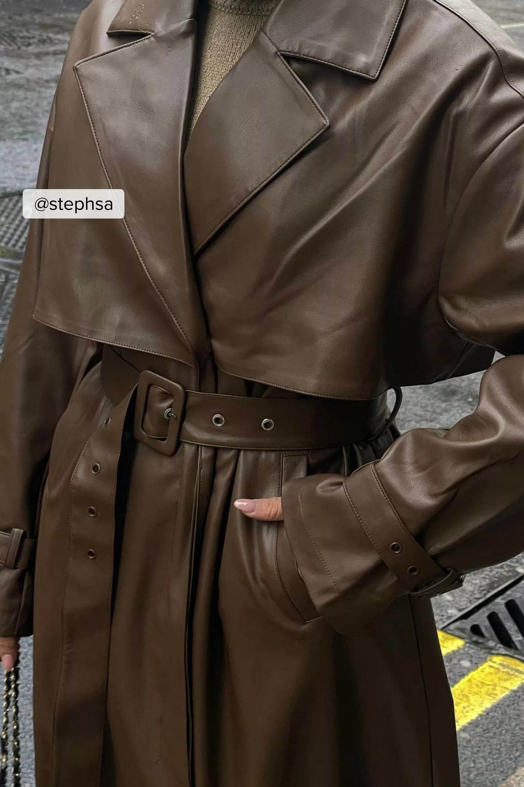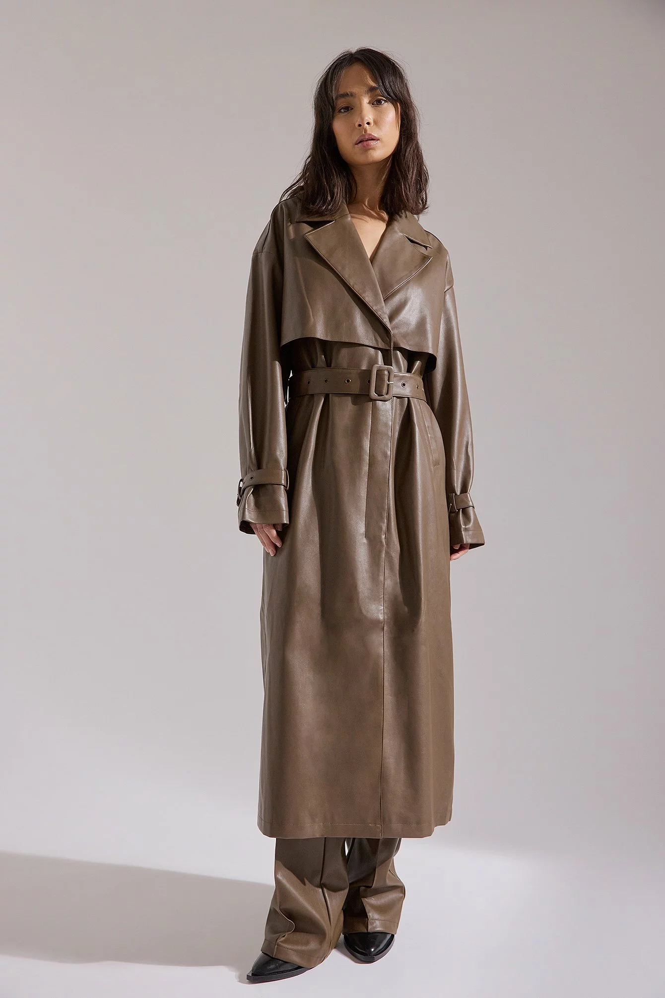 This trenchcoat features an oversized fit. It has a thin fabric lining and adjustable belt detail at the waist and on the sleeves. This trenchcoat features a wide lapel neckline, concealed button closures down the front, two side slanting pockets at the front and a back slit detail.