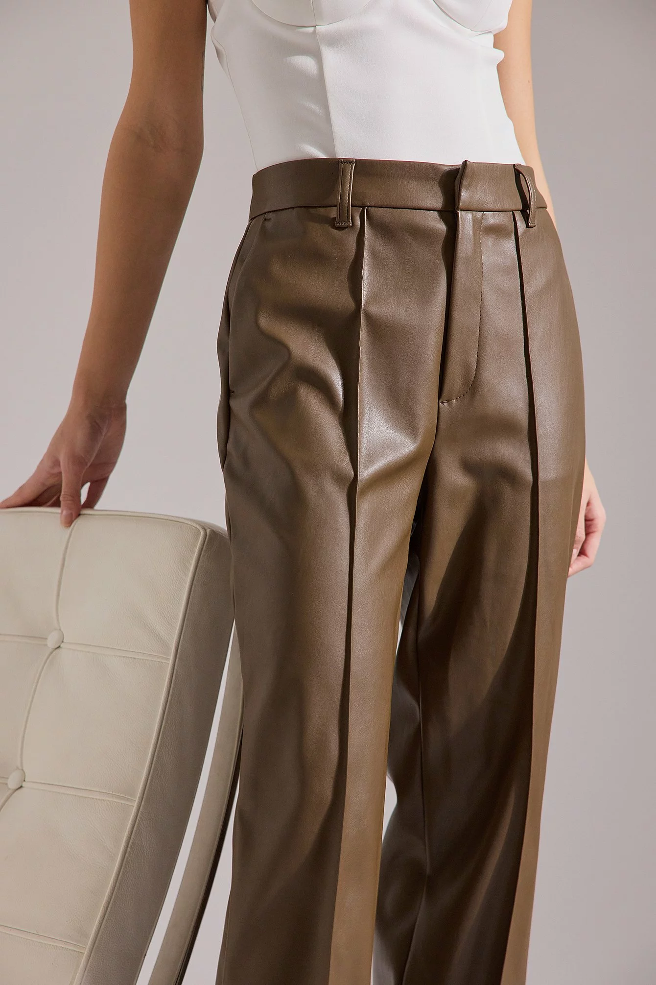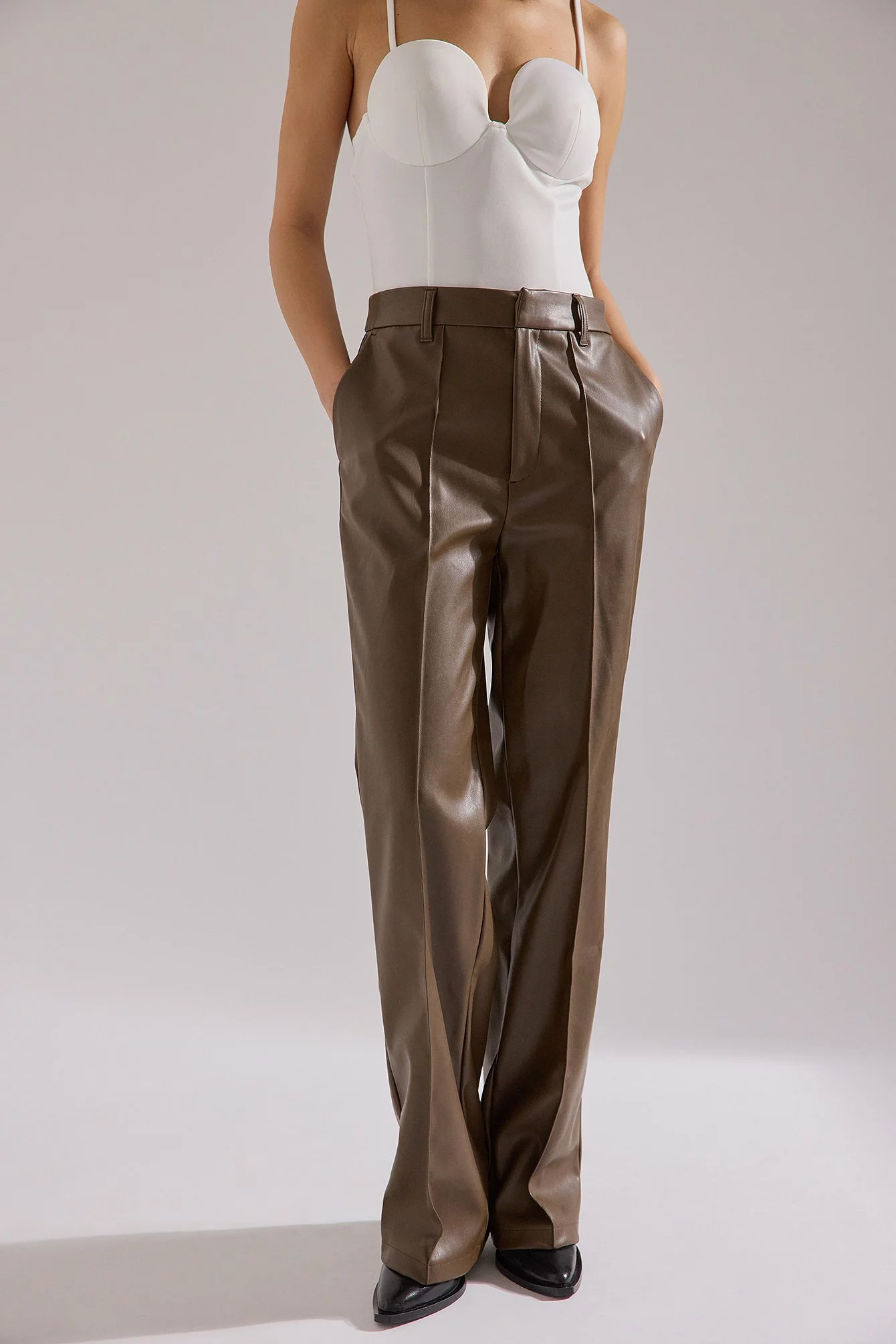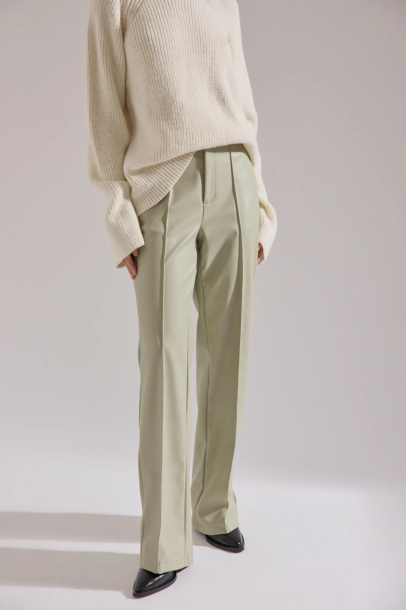 These trousers are made of PU and feature a straight fit. They have a high waist and side pockets. These trousers feature back mock pockets and a pleat detail at the front.