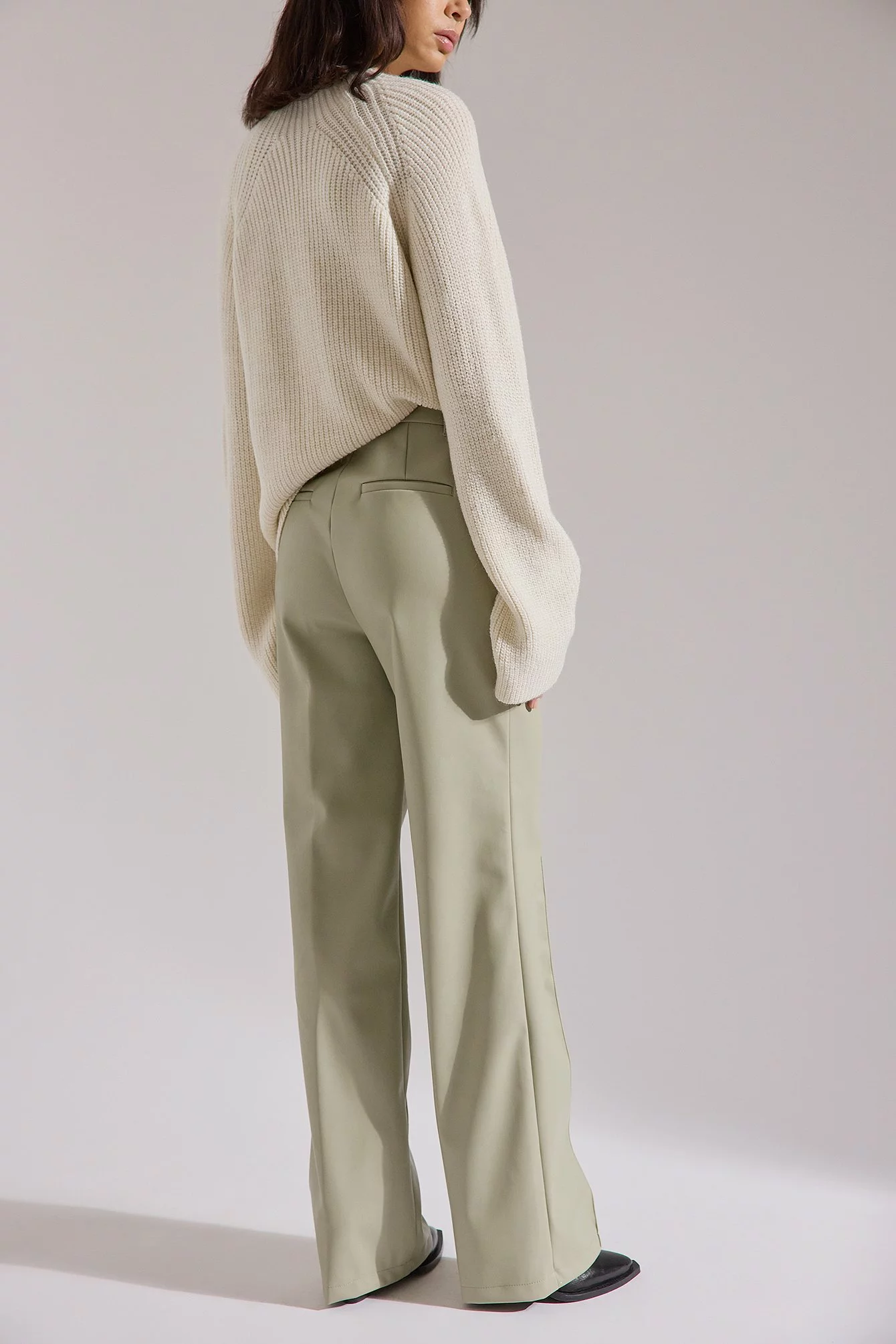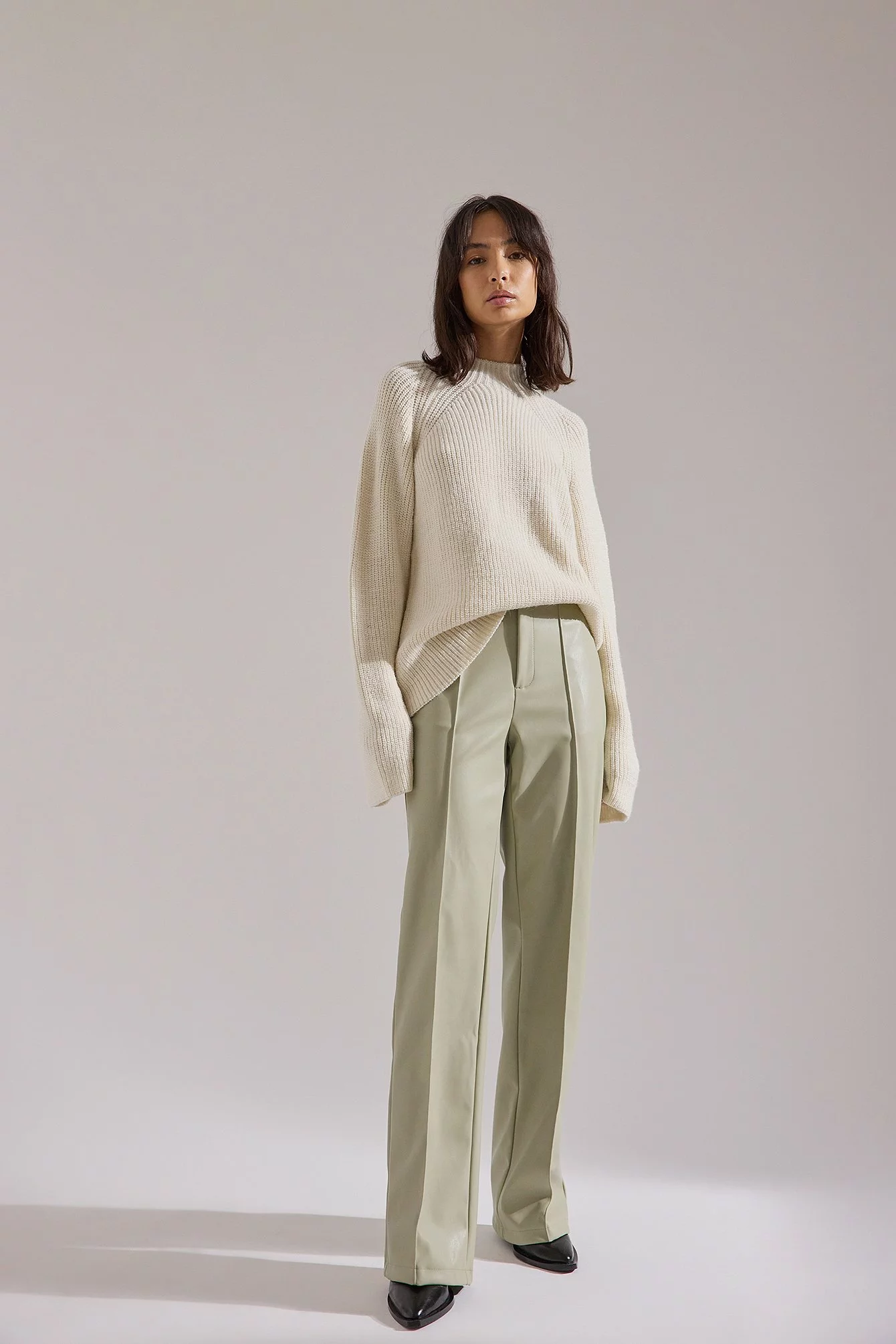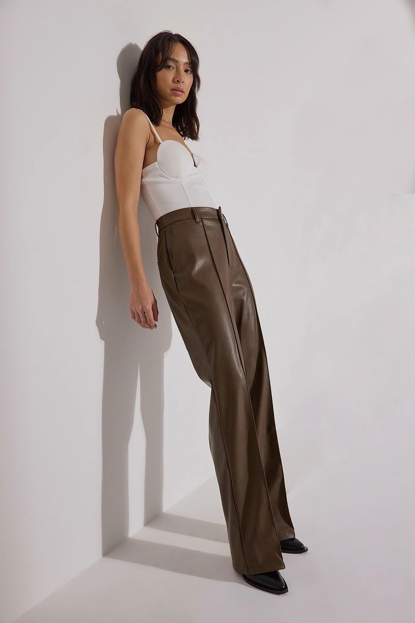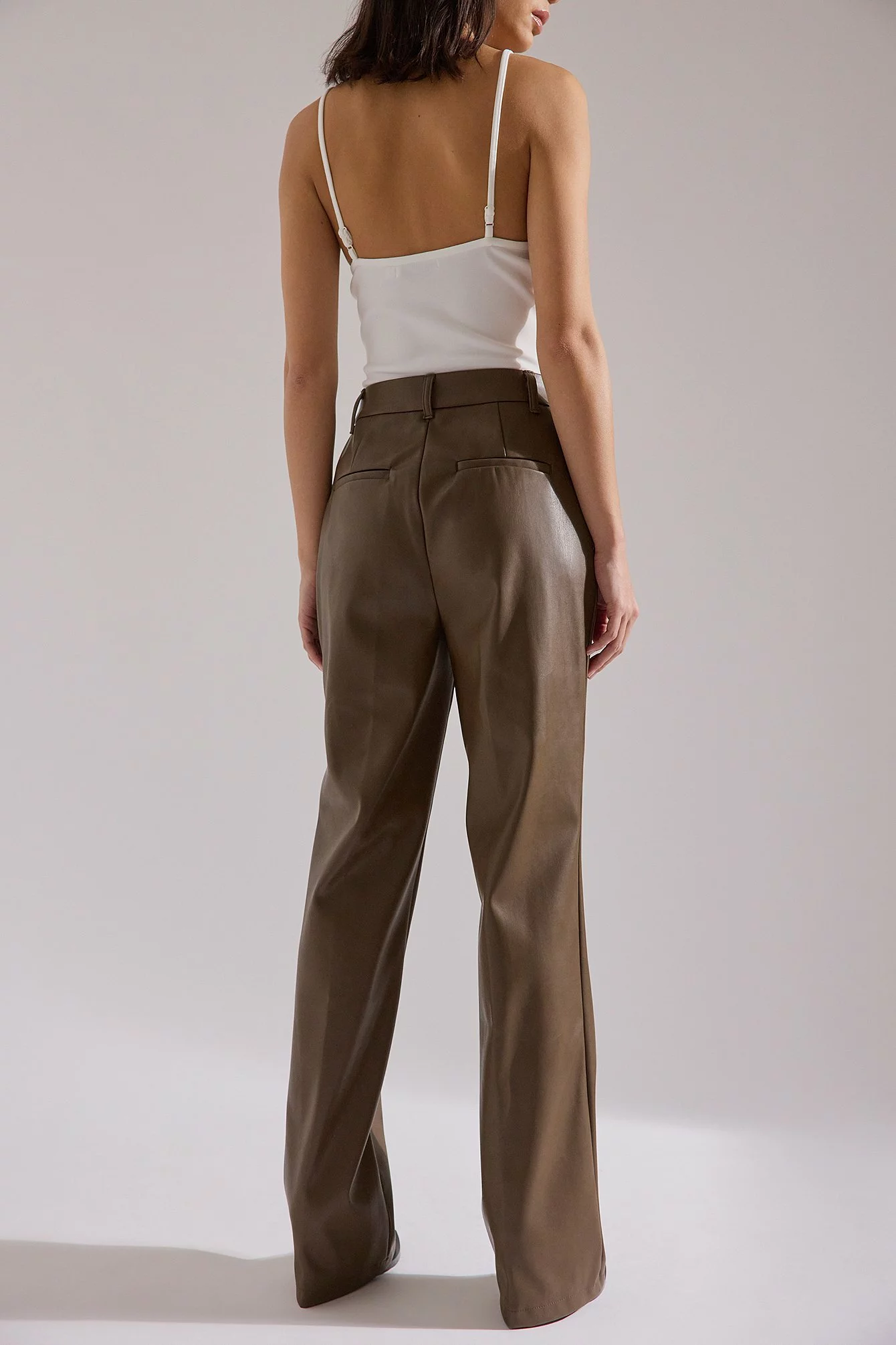 These trousers are made of PU and feature a straight fit. They have a high waist and side pockets. These trousers feature back mock pockets and a pleat detail at the front.