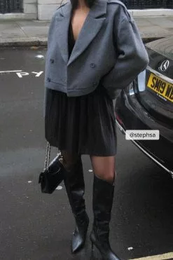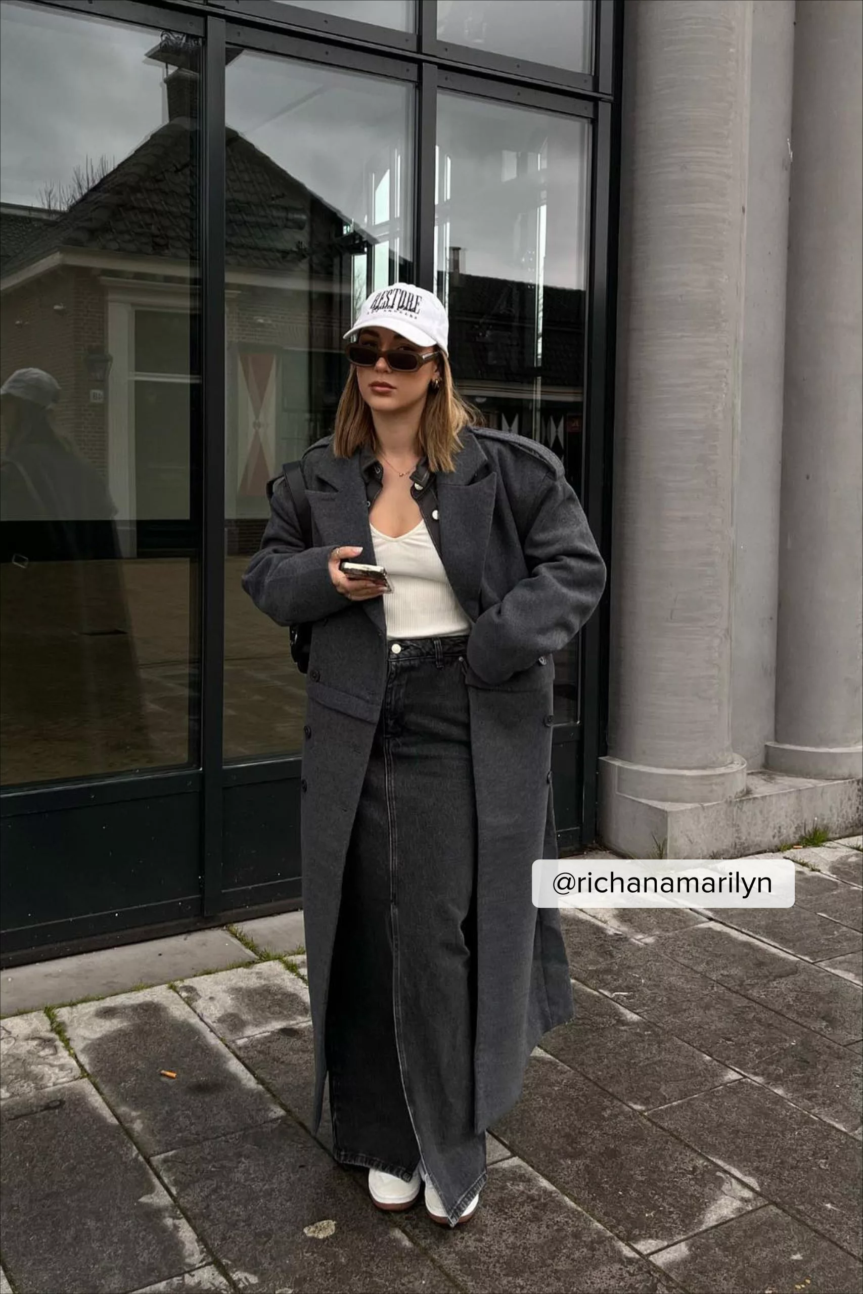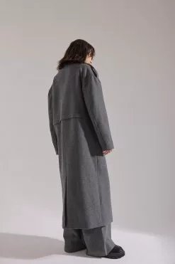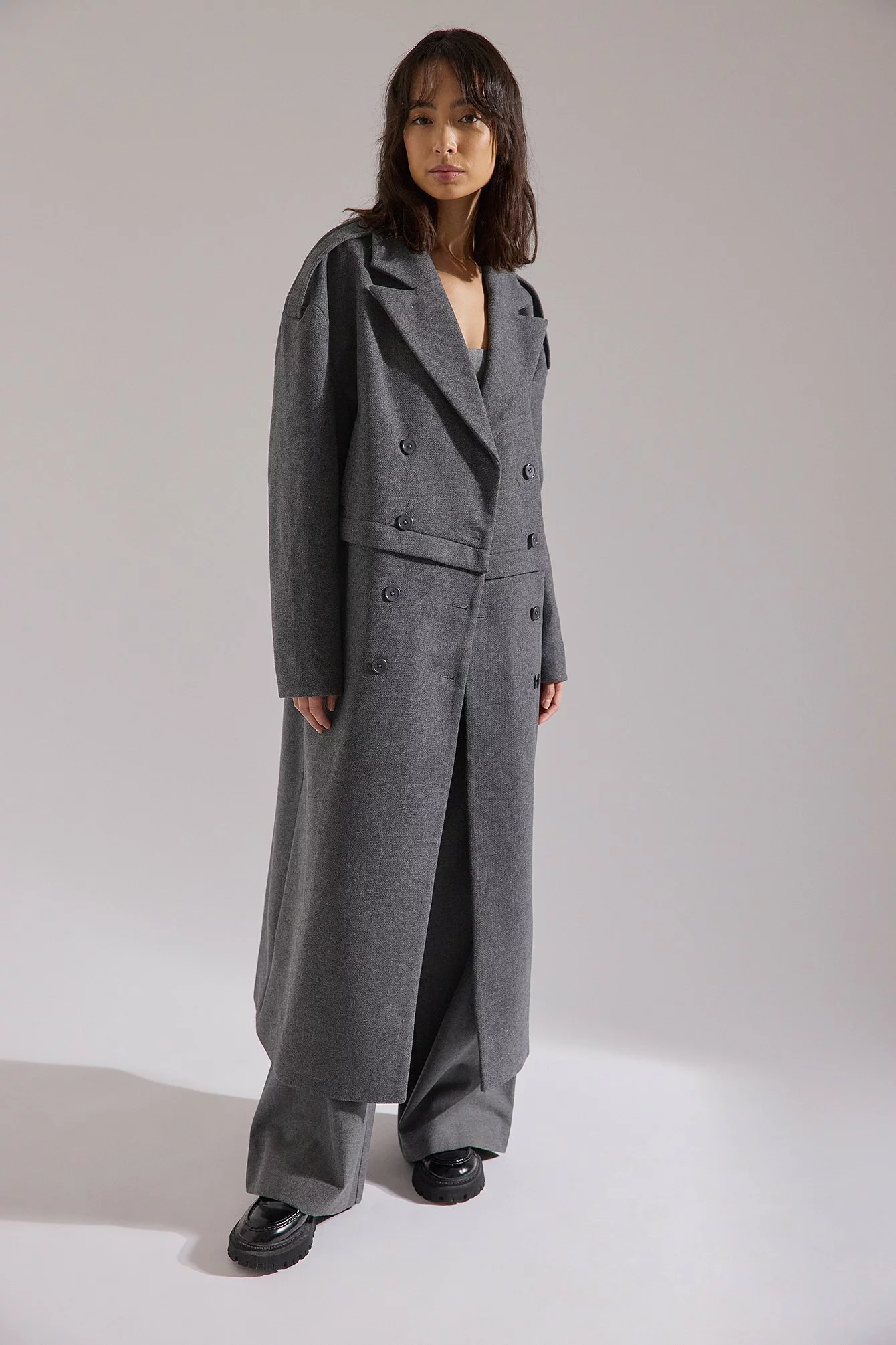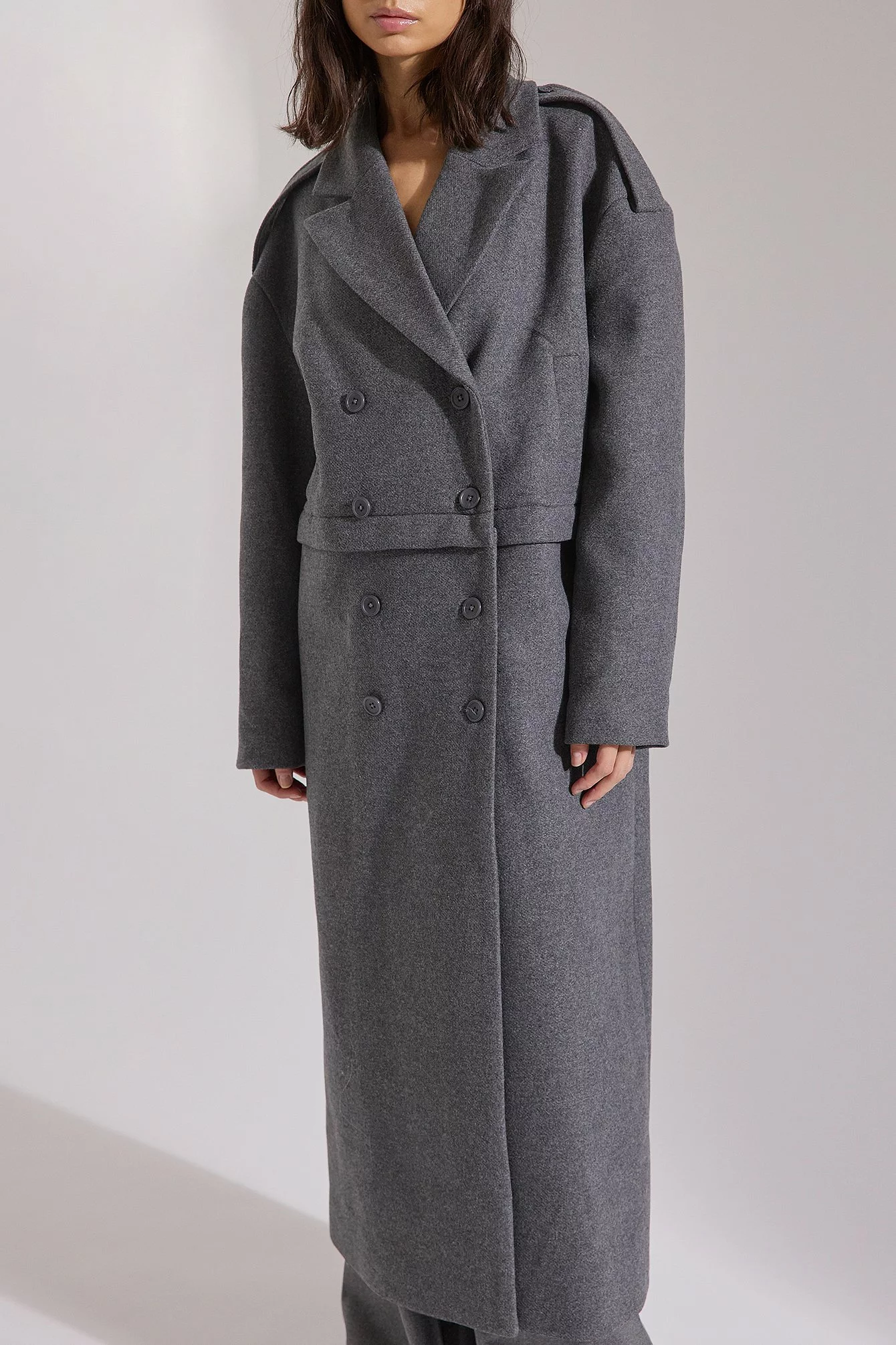 This coat is long and lined and features a lapel neckline. It has double-breasted button closure and chest pockets. This coat features a slit detail on the back and a removable bottom half with a zipper.