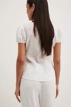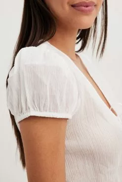 This blouse features a slightly sheer, structured material. It has a v neckline and puff sleeves with elasticized seams at the cuffs. This blouse features a self tie closure at the front.