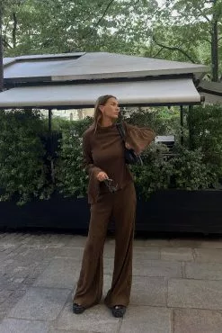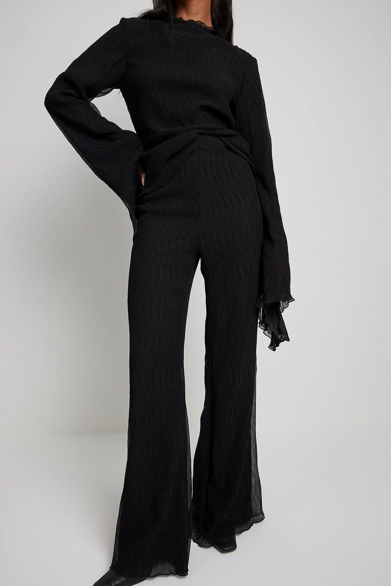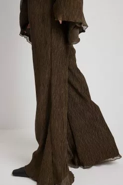 These trousers are textured and feature a high waist, a hidden side zipper closure, flared legs and a lining.