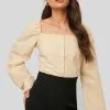 This shirt features a frilled neckline with a self tie detail, long sleeves and mesh material.